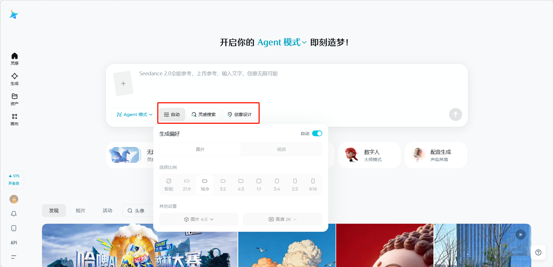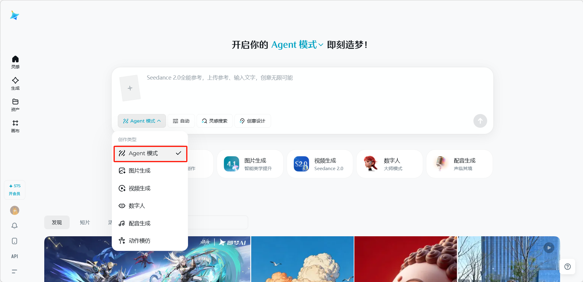 Agent模式是即梦AI的智能助手模式,可以根据用户的自然语言描述自动理解创作意图,并生成优化后的提示词。当用户不知道如何写提示词时,Agent模式是最好的起点——只需描述用户想要的效果,AI会帮用户完成从提示词生成到图片/视频输出的全过程。