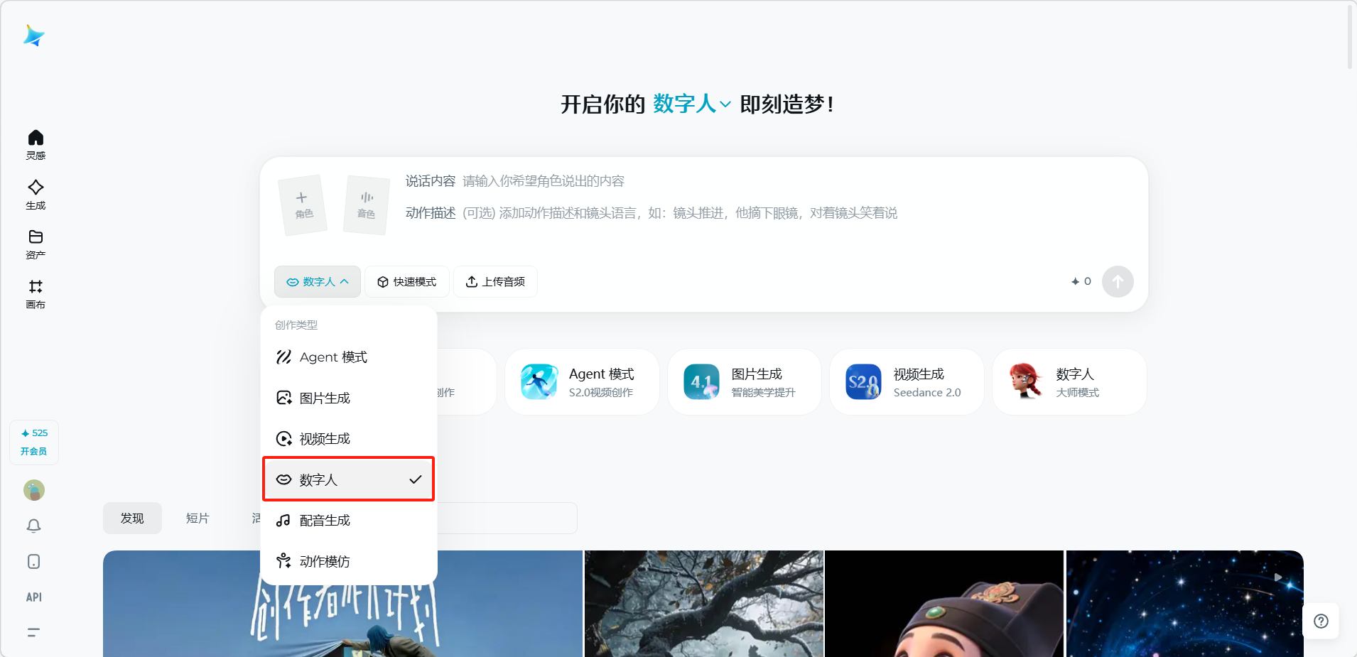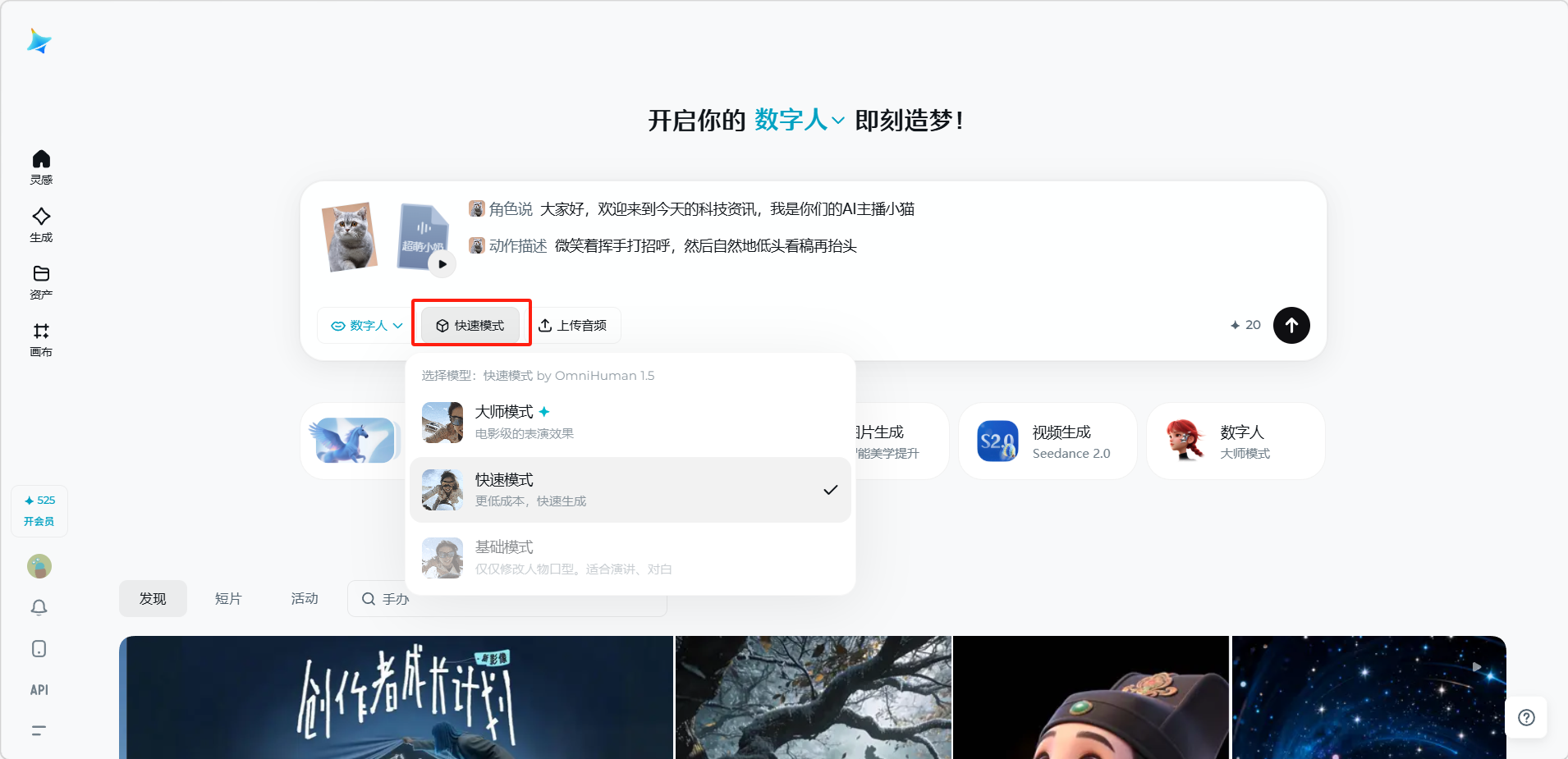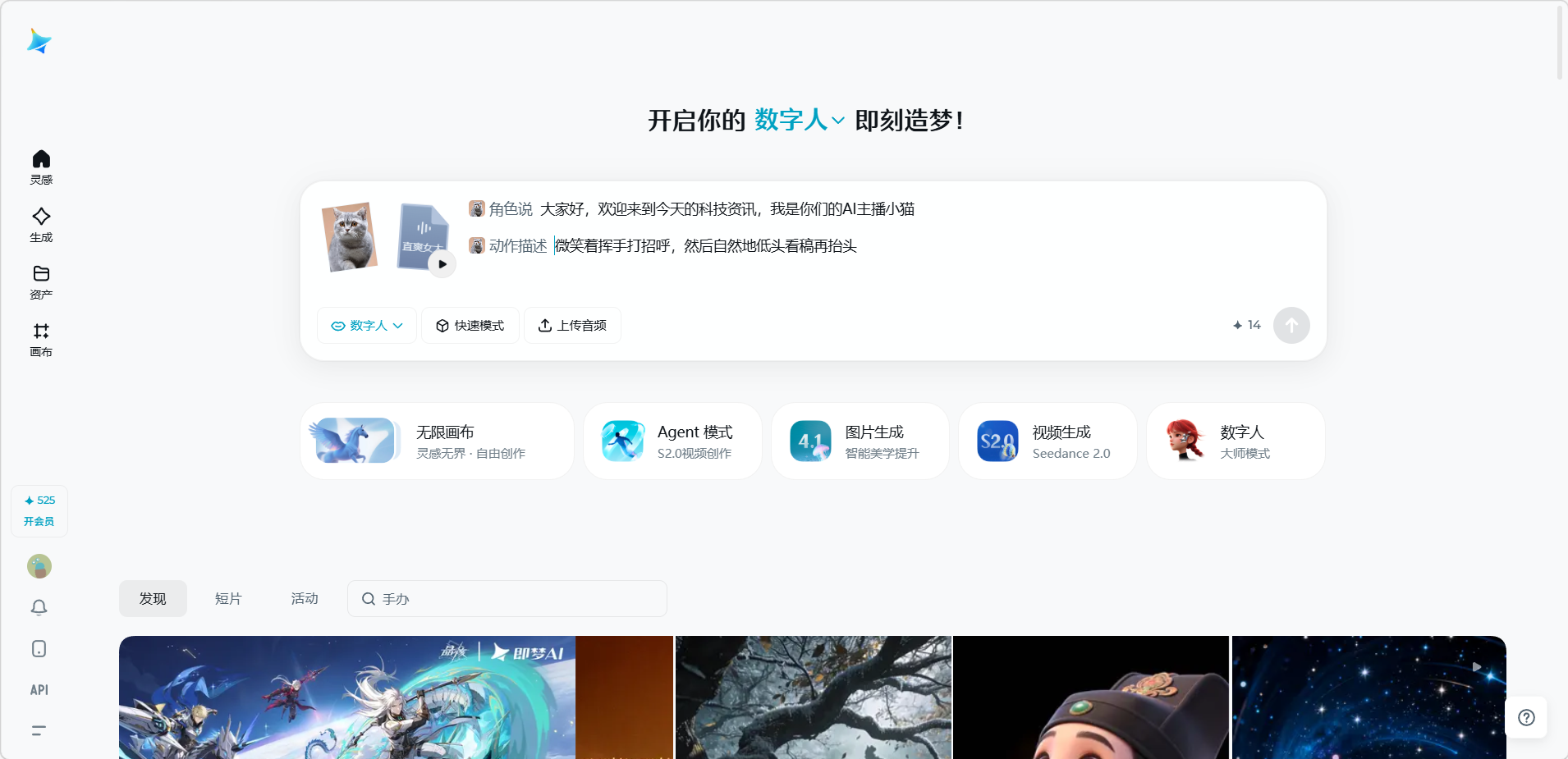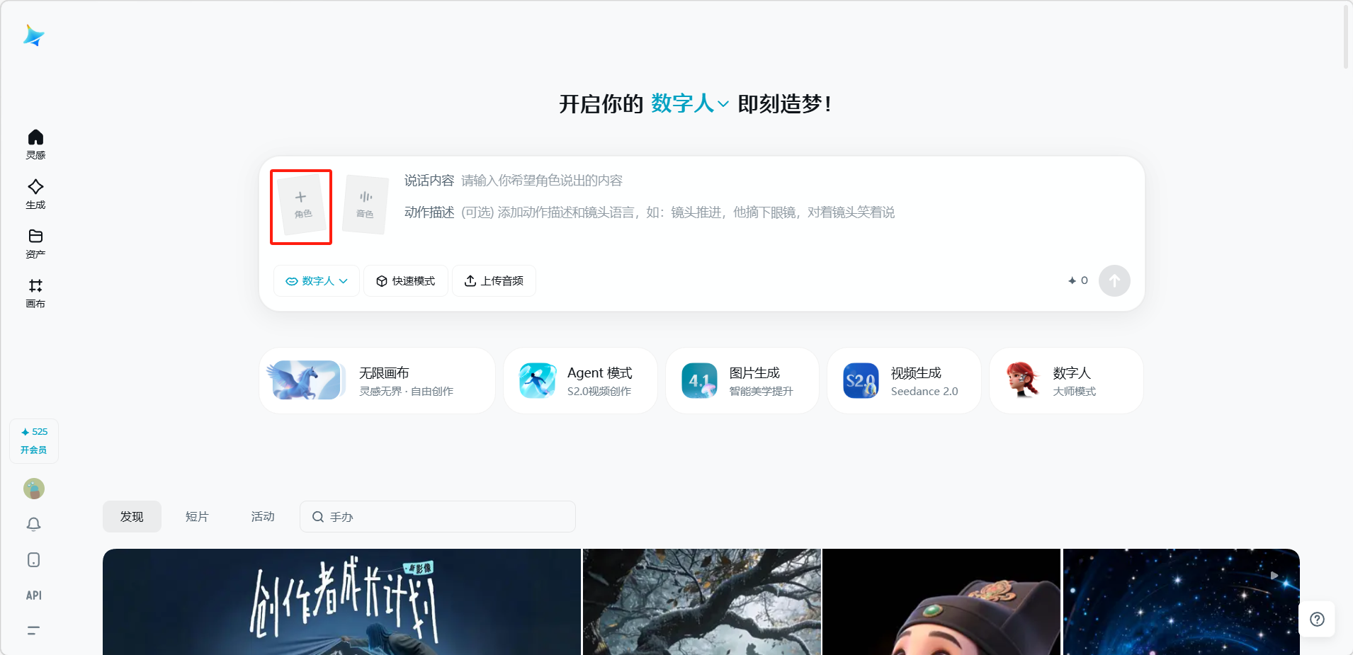 数字人功能可以让用户上传一张角色图片和一段音频(或直接输入文字),即可生成角色"开口说话"的视频。数字人功能基于 OmniHuman 模型,能够实现嘴部、面部表情和身体动作的自然协调,适用于演讲、对白、短视频口播等场景。