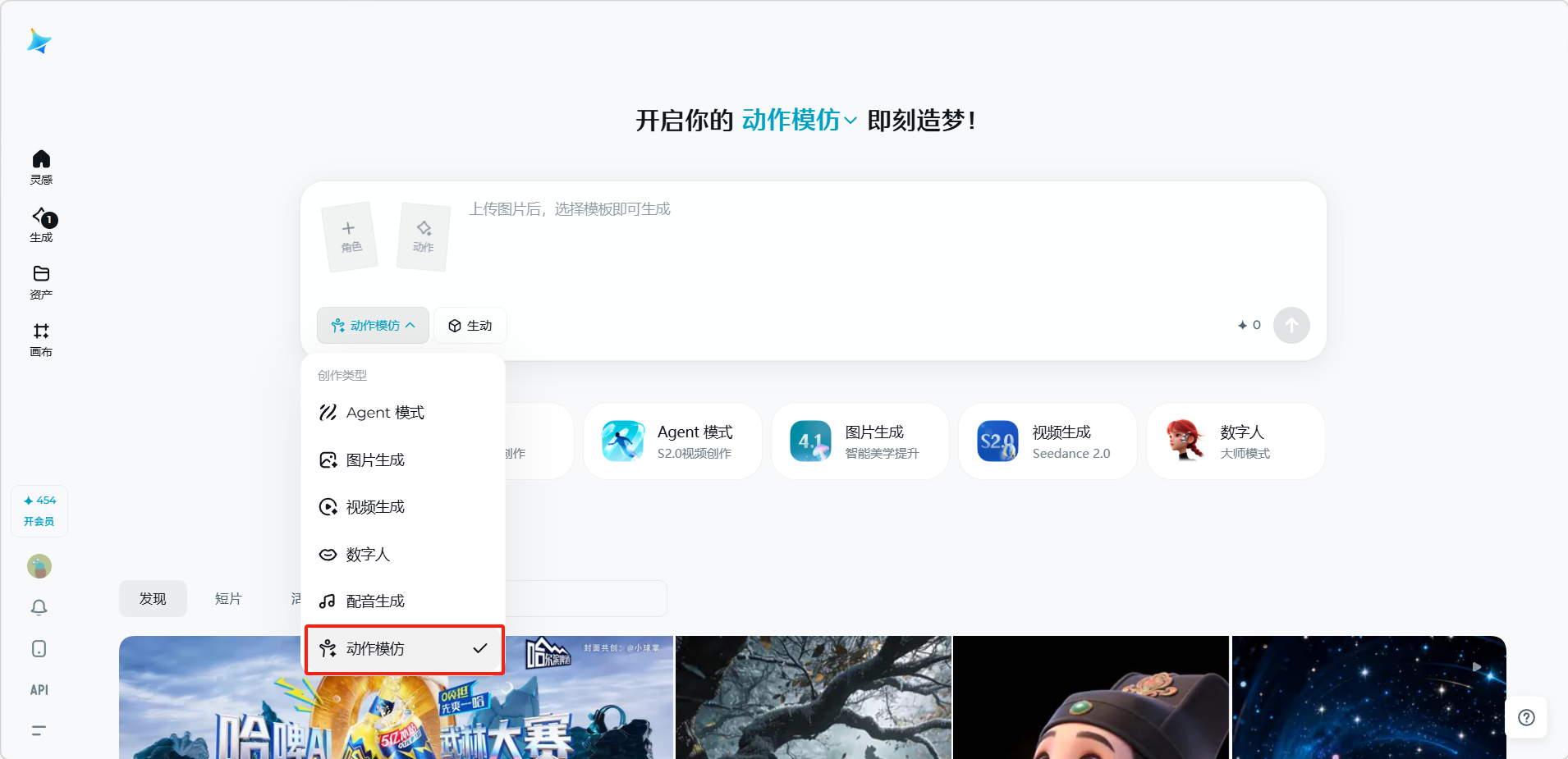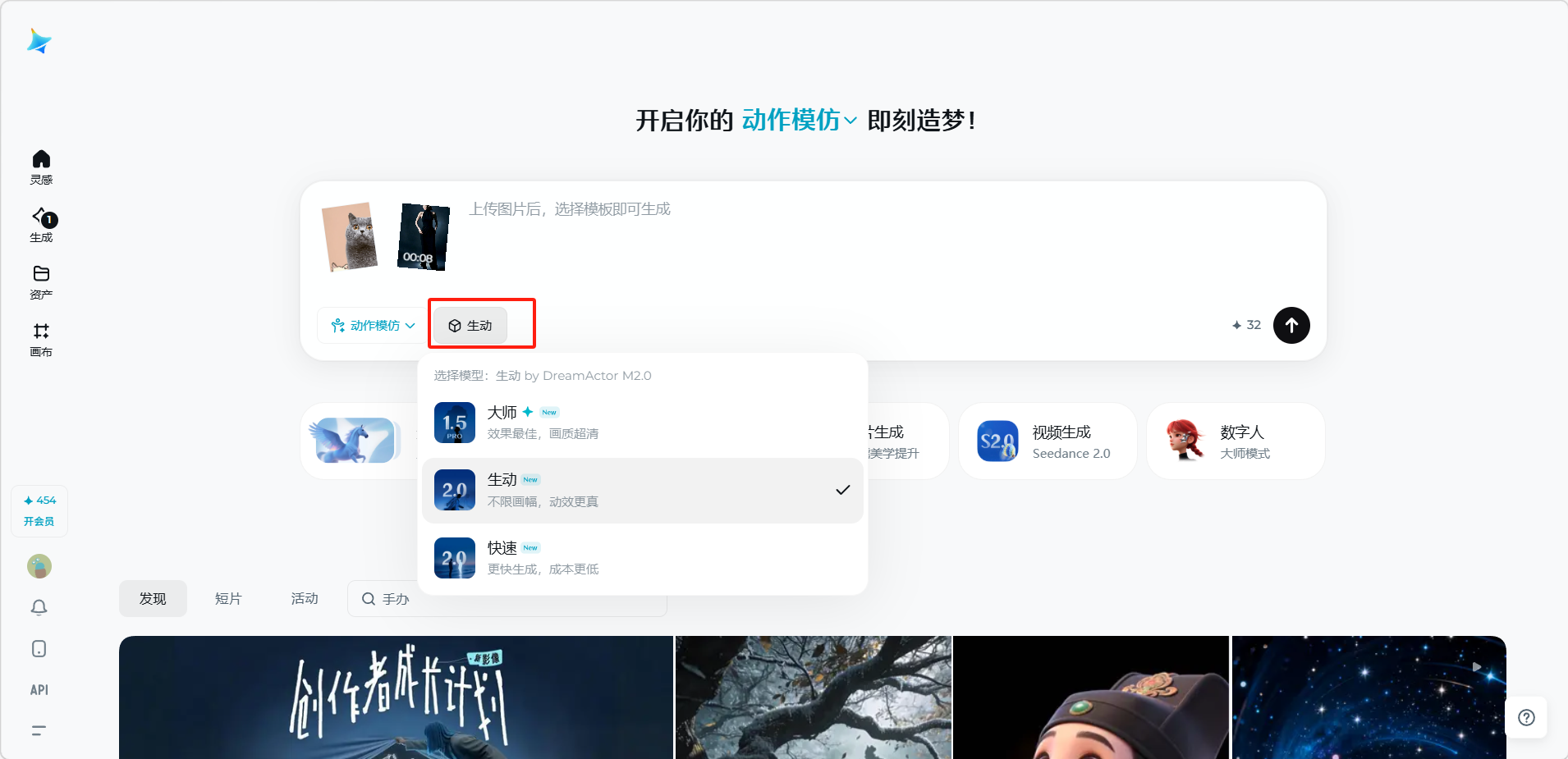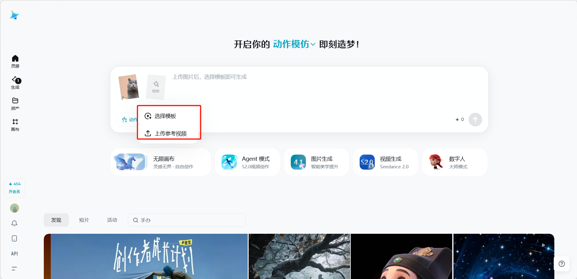 选择动作来源(点击「动作」按钮选择平台提供的动作模板,或上传自定义动作视频)