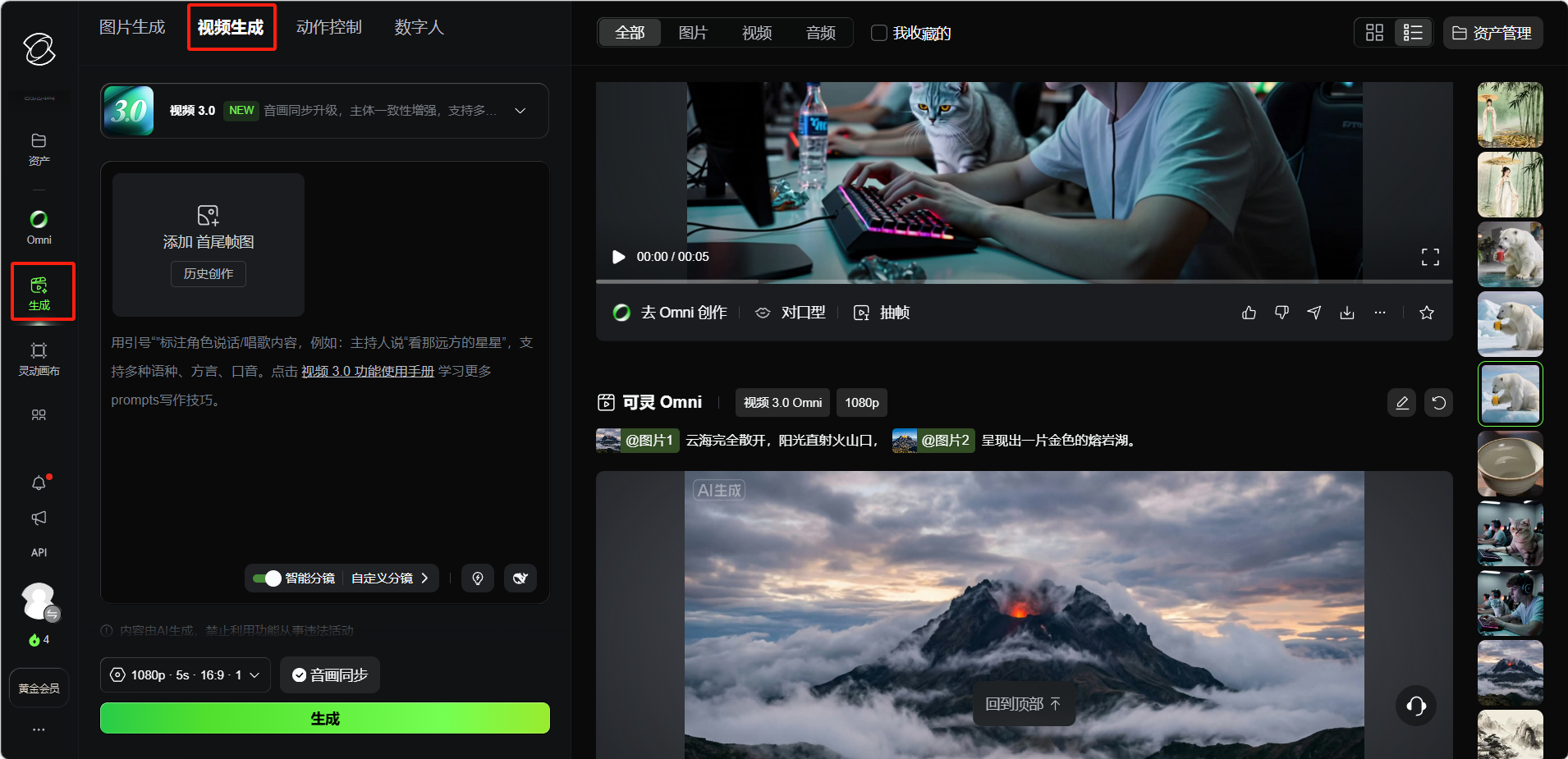 视频生成是可灵 AI 的核心功能,支持文生视频和图生视频两种方式。文生视频即输入一段文字描述,模型根据文本生成相应视频画面;图生视频则是上传首帧图(或首尾帧),结合文字描述生成动态视频。当前最新的视频 3.0 模型在音画同步、主体一致性和多镜头叙事方面实现了全面升级。