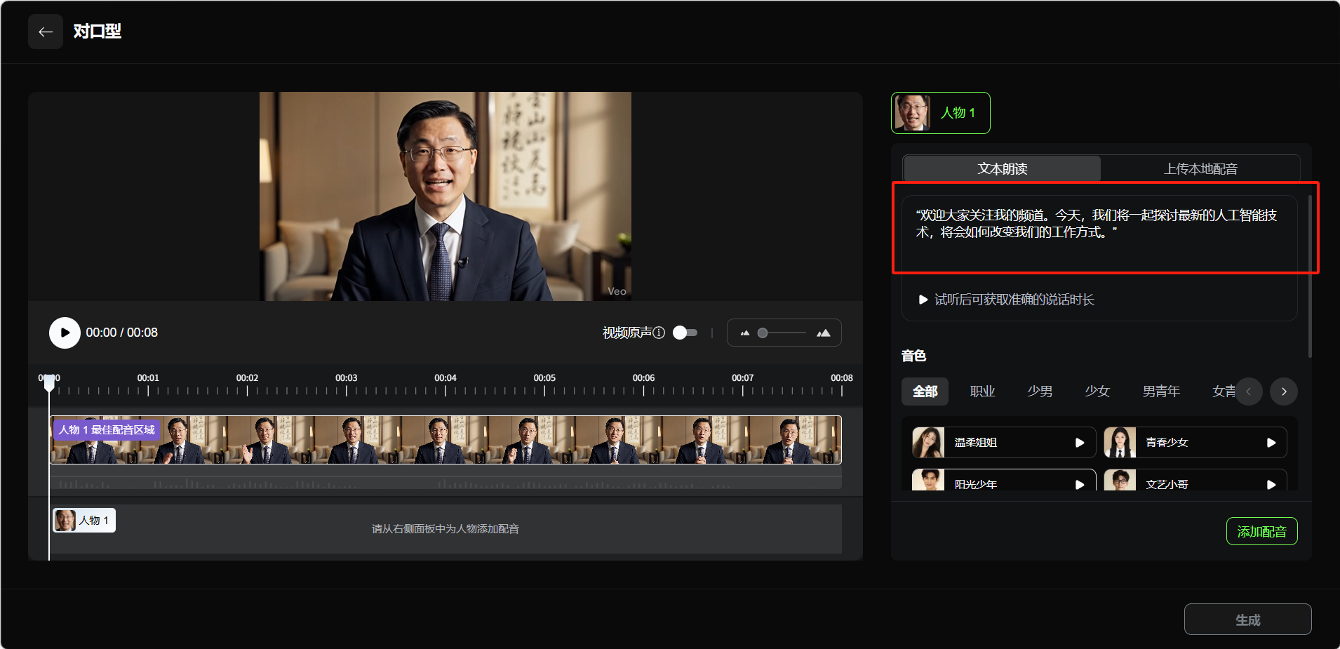 - 建议上传时长较短的视频,确保口型同步的精准度
