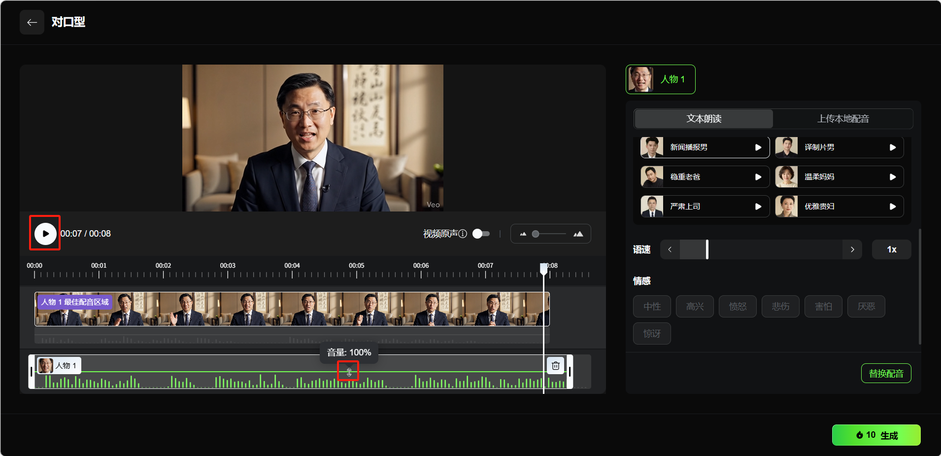 点击播放键试听,拖动中间的横线可以调节音量。确认后点击「生成」即可。