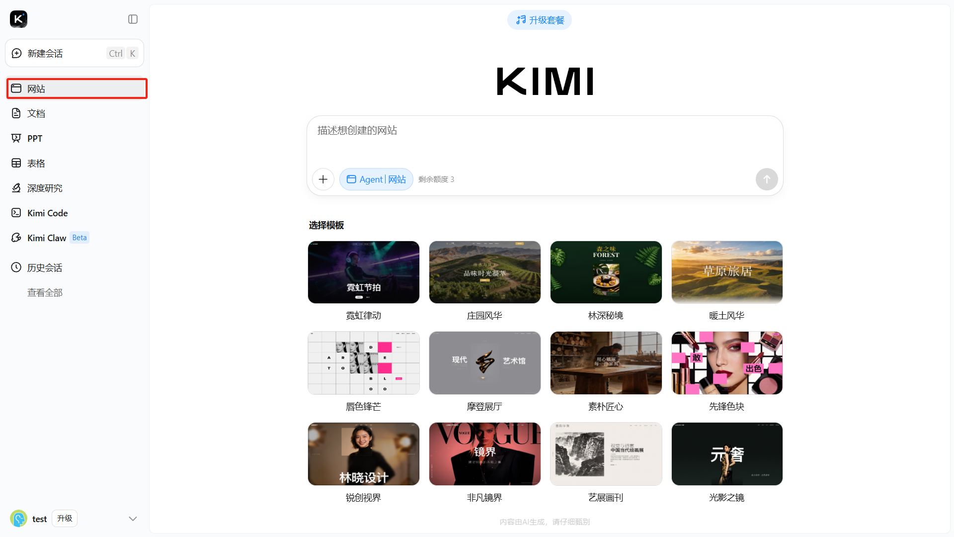 在 Kimi 界面左侧边栏中,点击「网站」功能入口,即可使用该能力。用户只需以自然语言描述所需页面的内容与样式,系统将自动生成可运行的网页代码,适合无编程基础的用户快速搭建原型页面。页面下方还提供了多种预设模板,用户可根据需求直接选用并在此基础上进行修改。