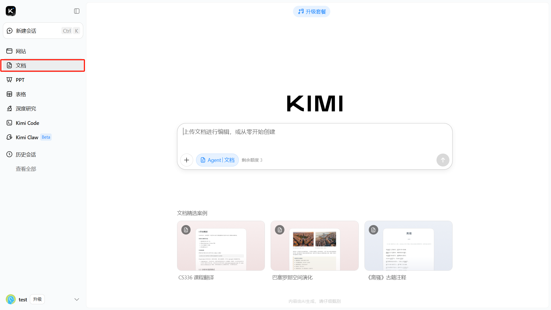 Kimi的文档功能支持从零开始创建文档,还能从发票、会议记录等杂乱资料中快速提炼关键要点,并整理排版、写批注、生成专业的文档。点击左侧边栏「文档」功能启动。