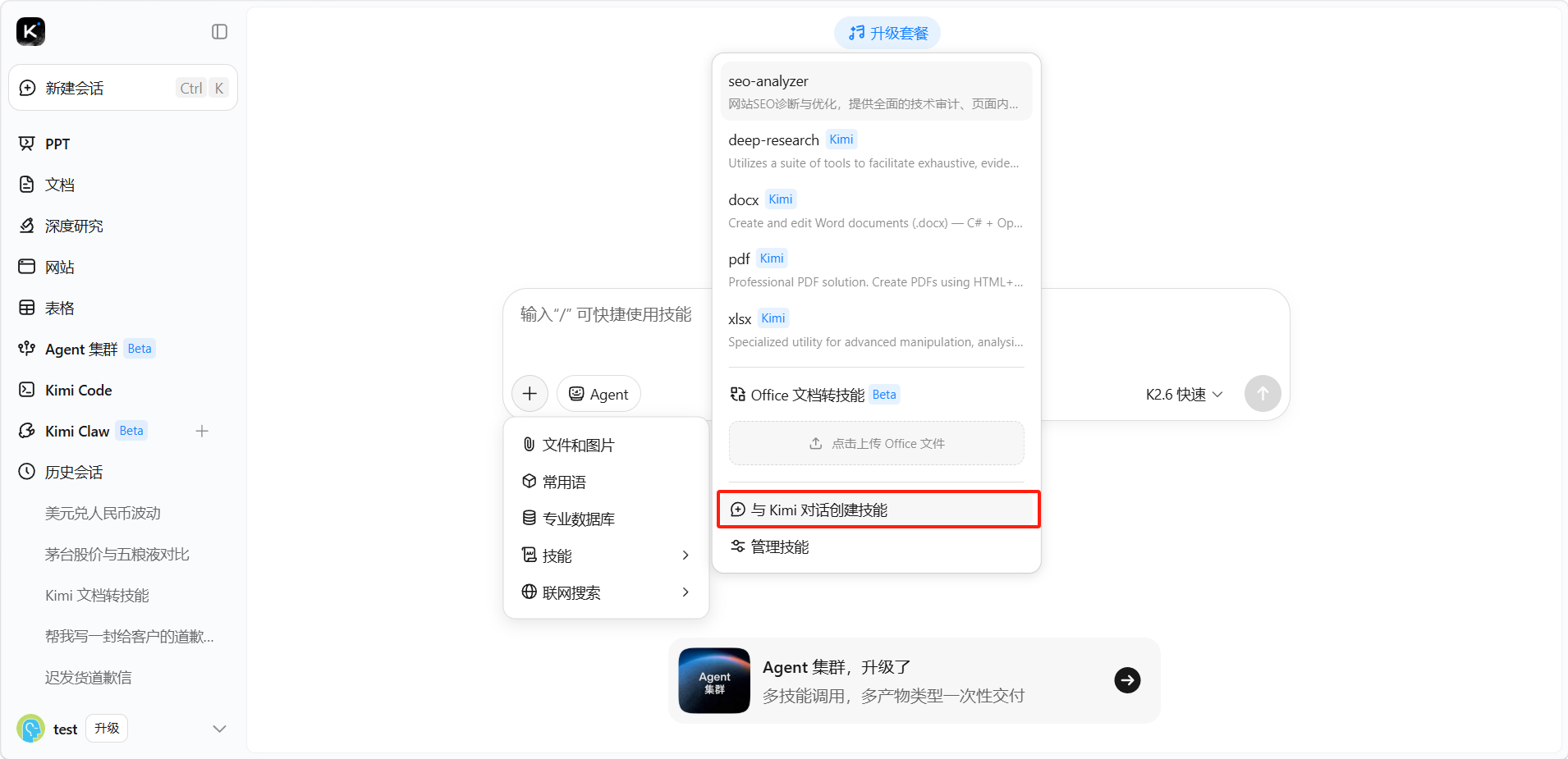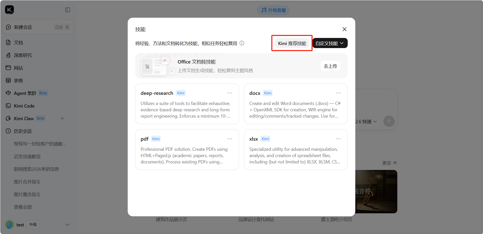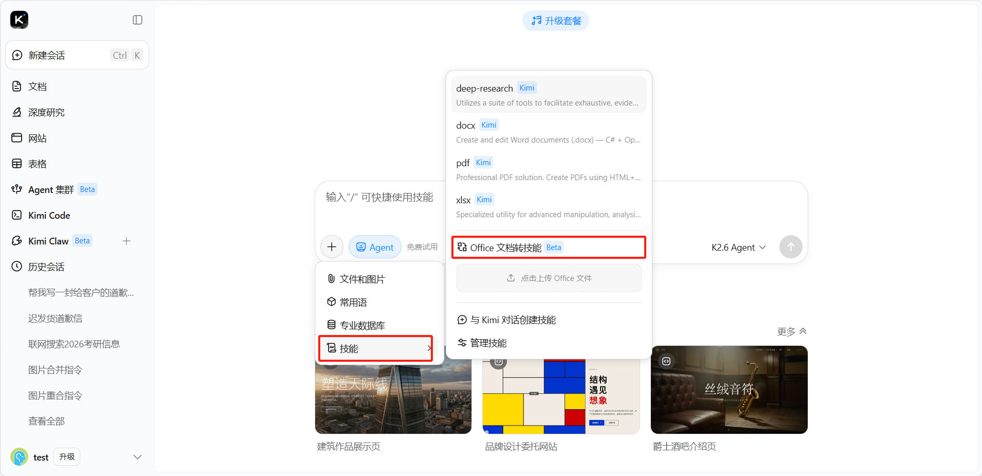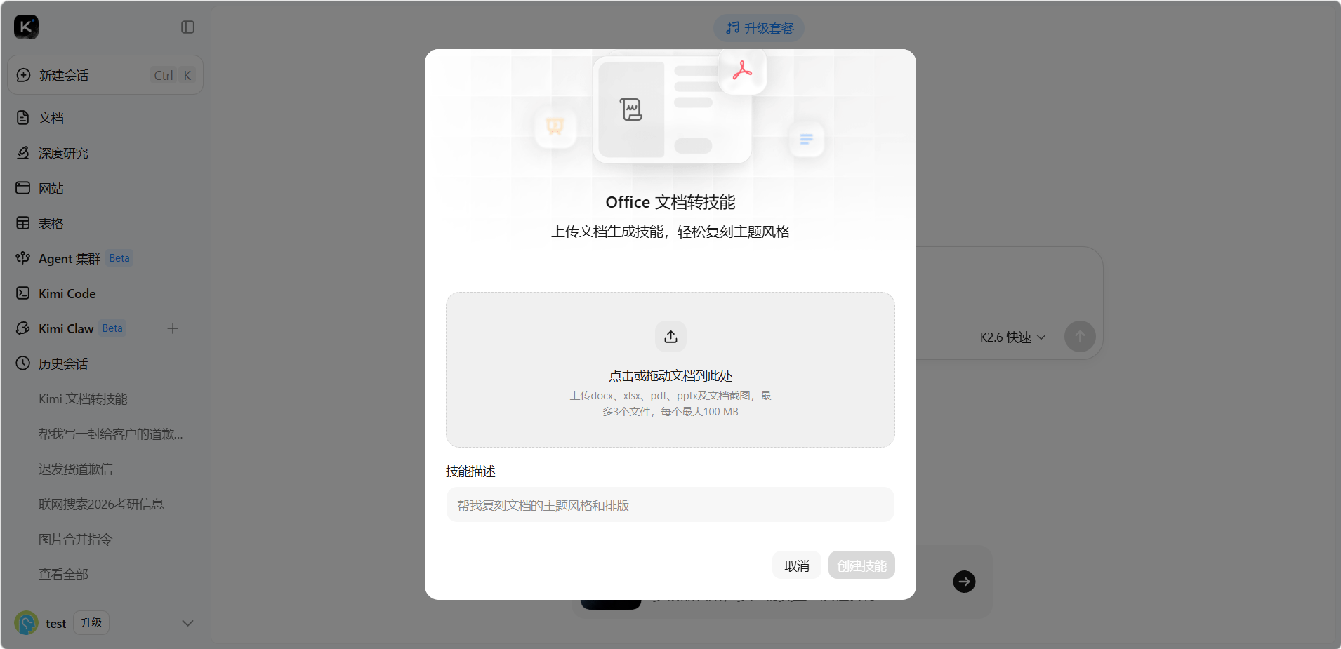 上传Office文件,输入技能的需求,Kimi会自动分析文件内容并转换成技能。