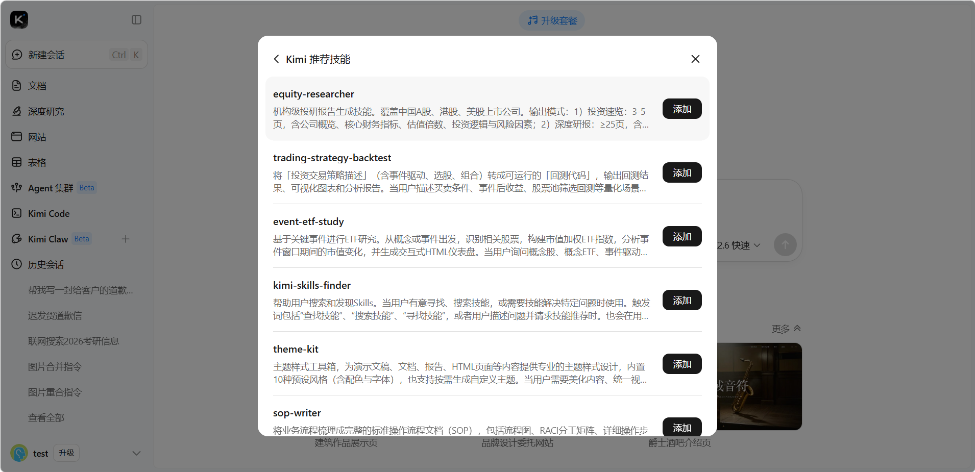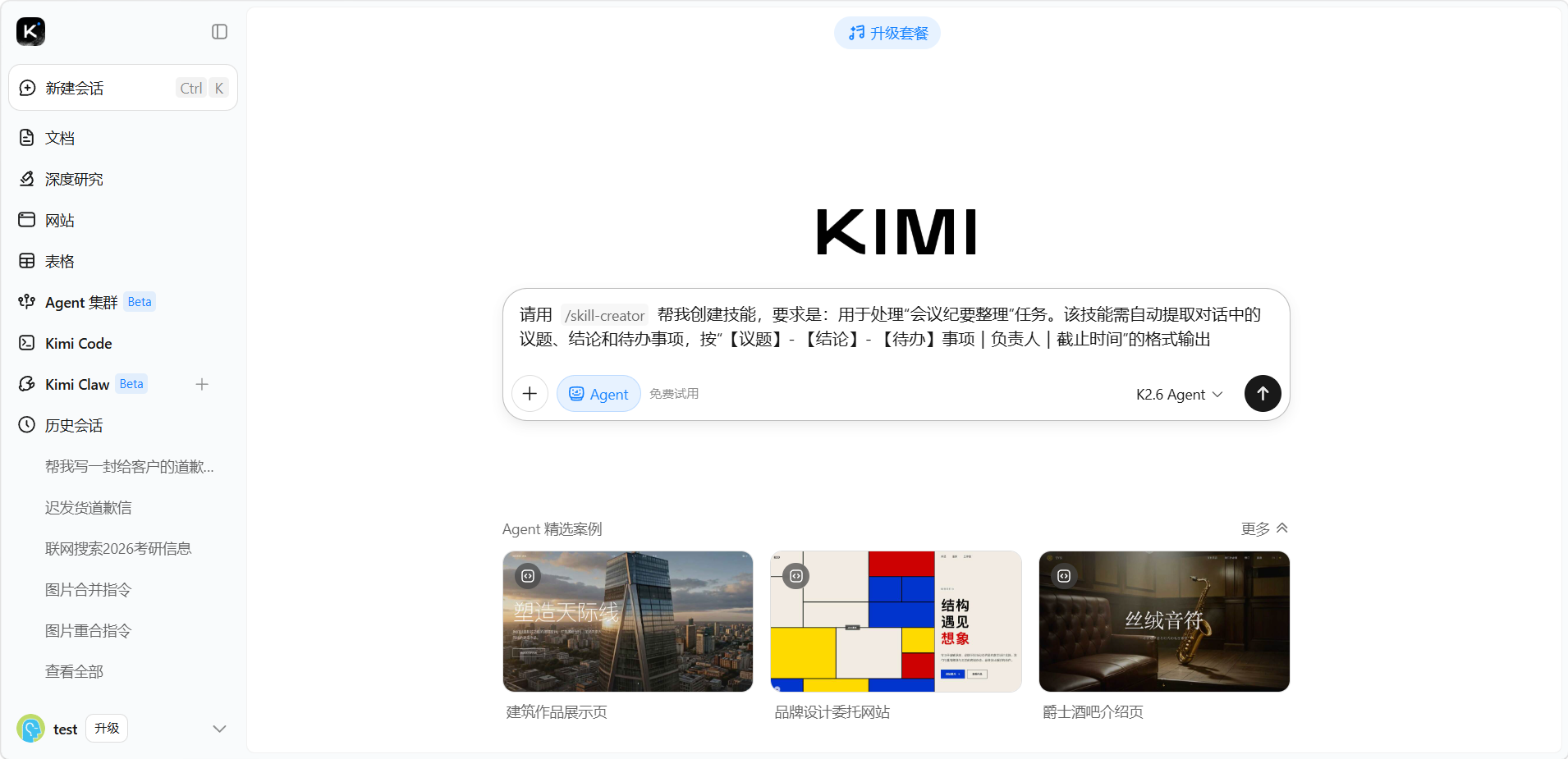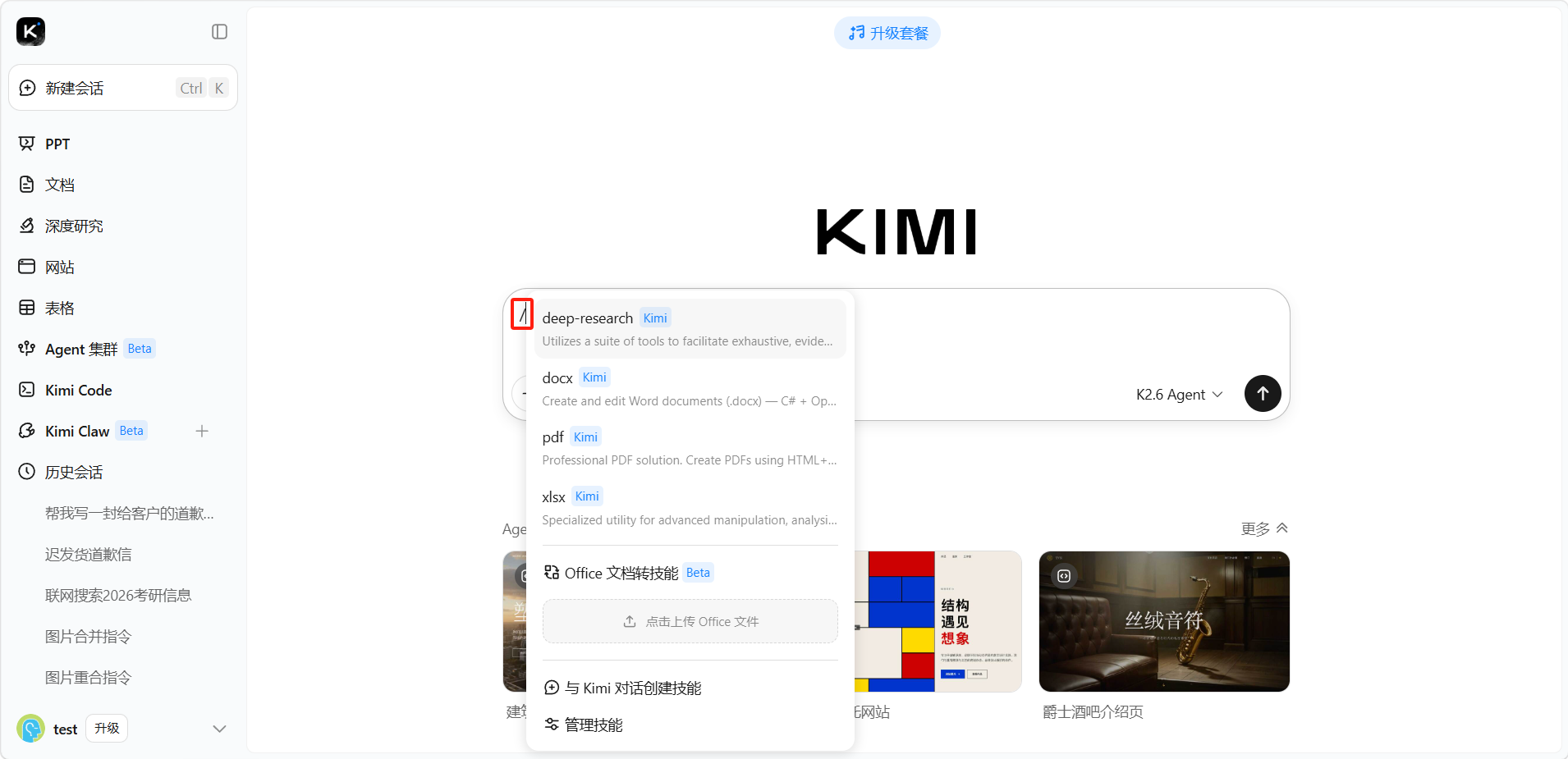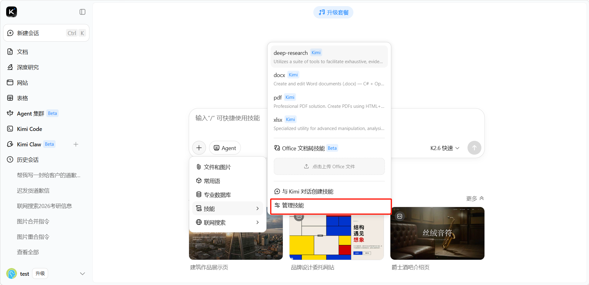 上传Office文件,输入技能的需求,Kimi会自动分析文件内容并转换成技能。