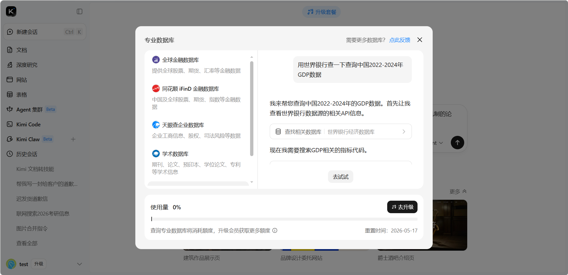 专业数据库是 Kimi 为学术研究、金融分析、企业调研等高阶场景打造的专业级信息检索功能。它接入了多个权威数据源,让 Kimi 能直接从可靠的专业库中调取数据,有效避免了通用 AI 容易编造内容的问题。与普通的联网搜索不同,专业数据库获取的不是网页上的二手资讯,而是经过验证的结构化专业数据。