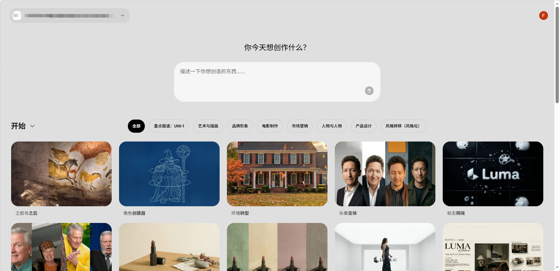 登录后进入 Luma 主页,会看到以下核心区域: