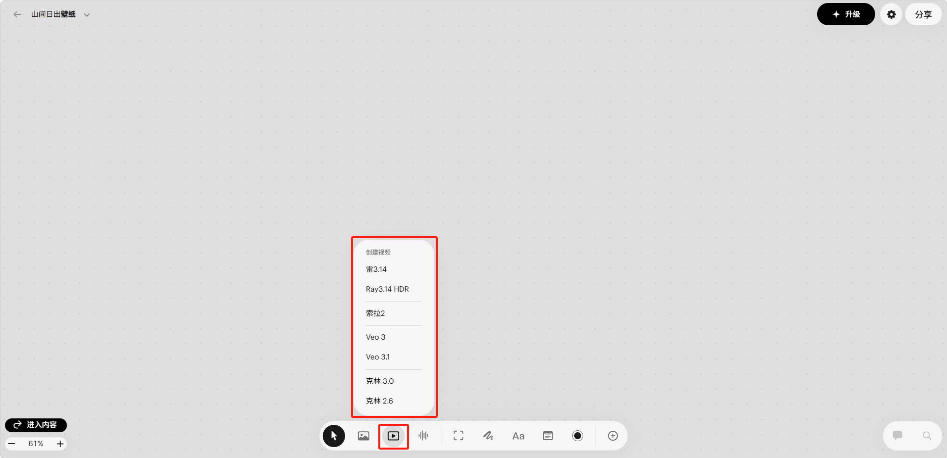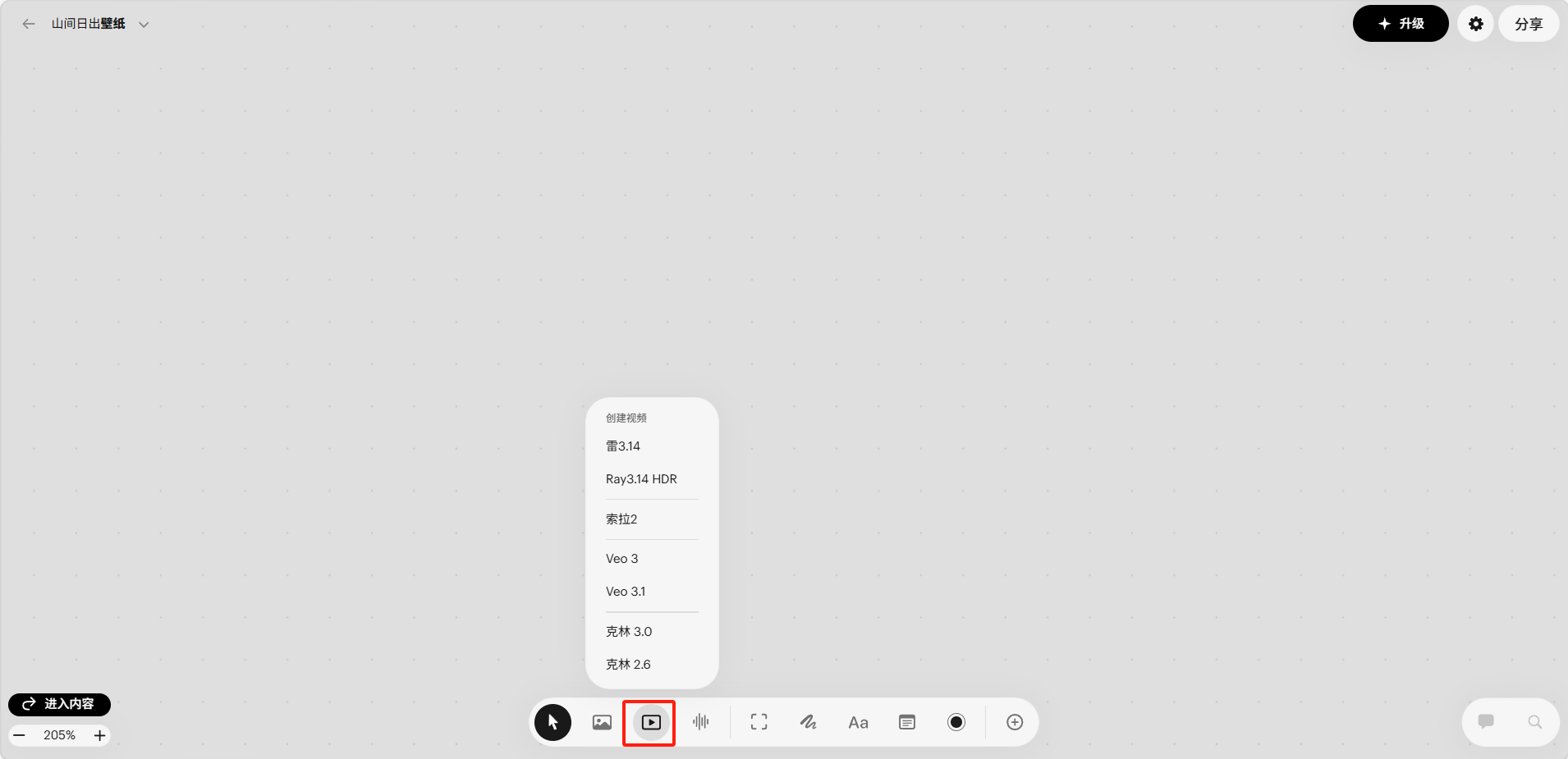 点击底部工具栏的视频工具(播放图标),会弹出视频模型选择菜单: