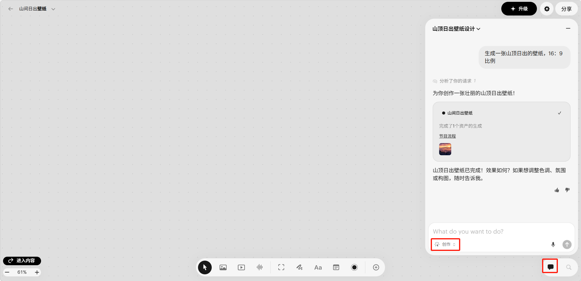 在画板右侧的聊天面板中,确保模式选择为「创作(Create)」。