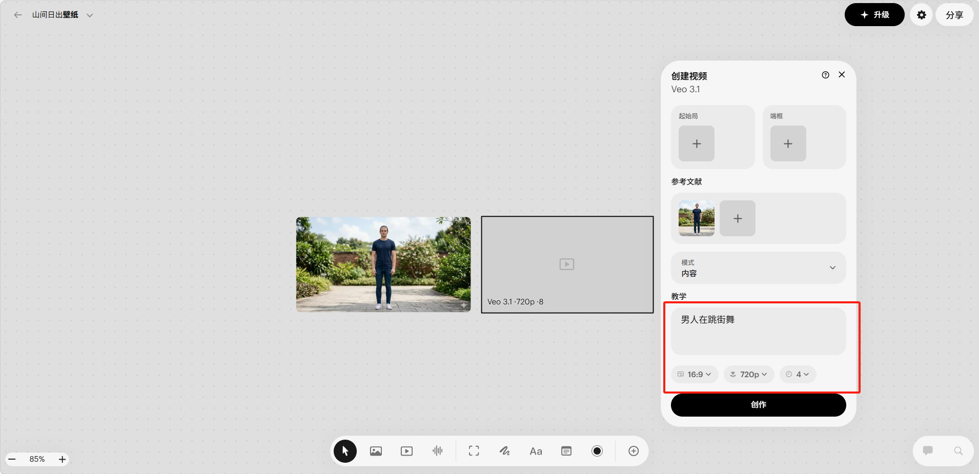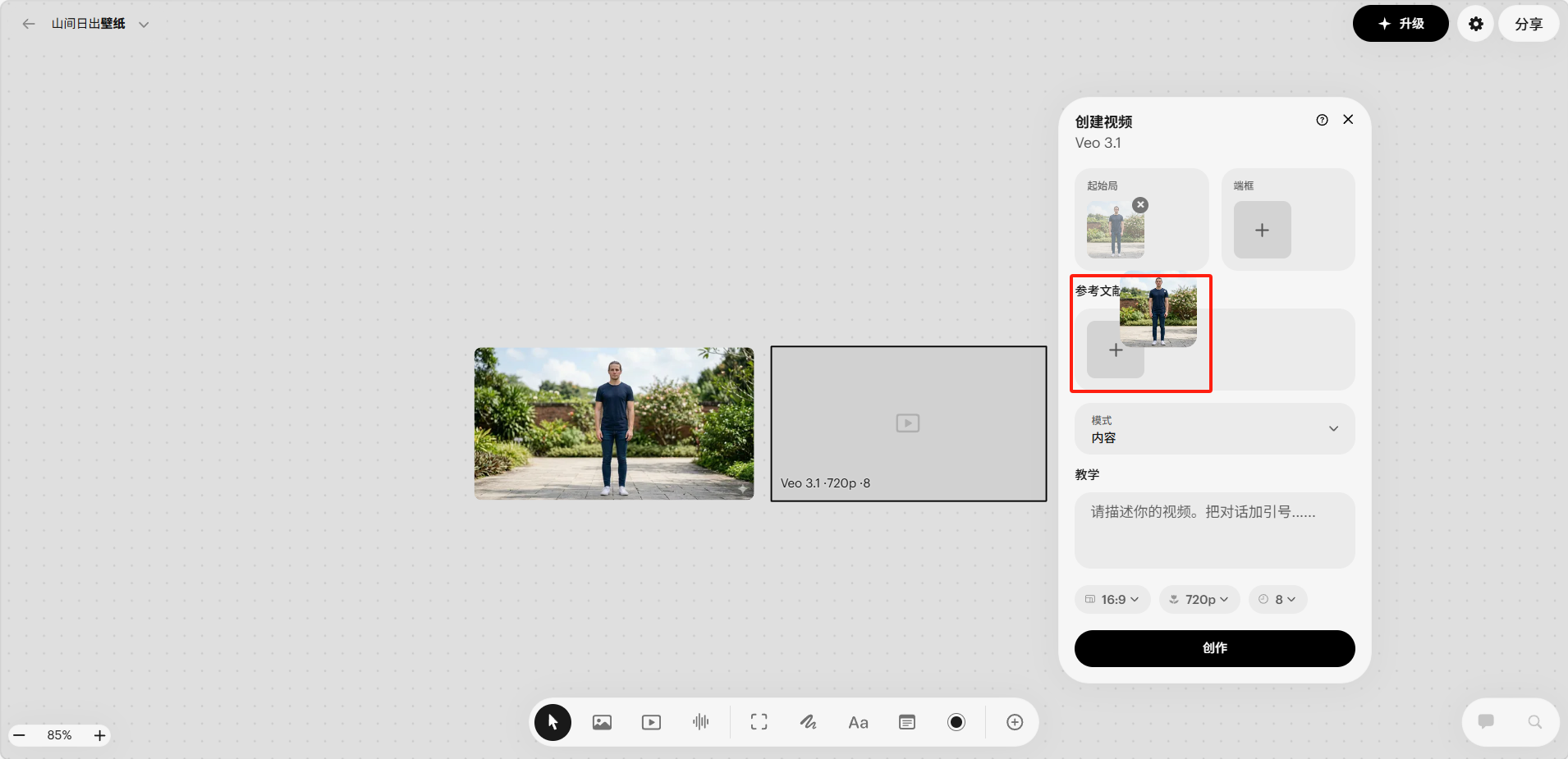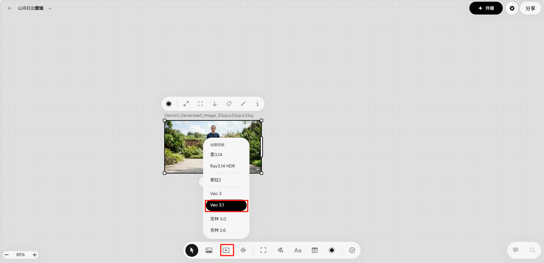 选中图片。并选择下方工具栏的视频工具,选择「Veo3.1」模型。