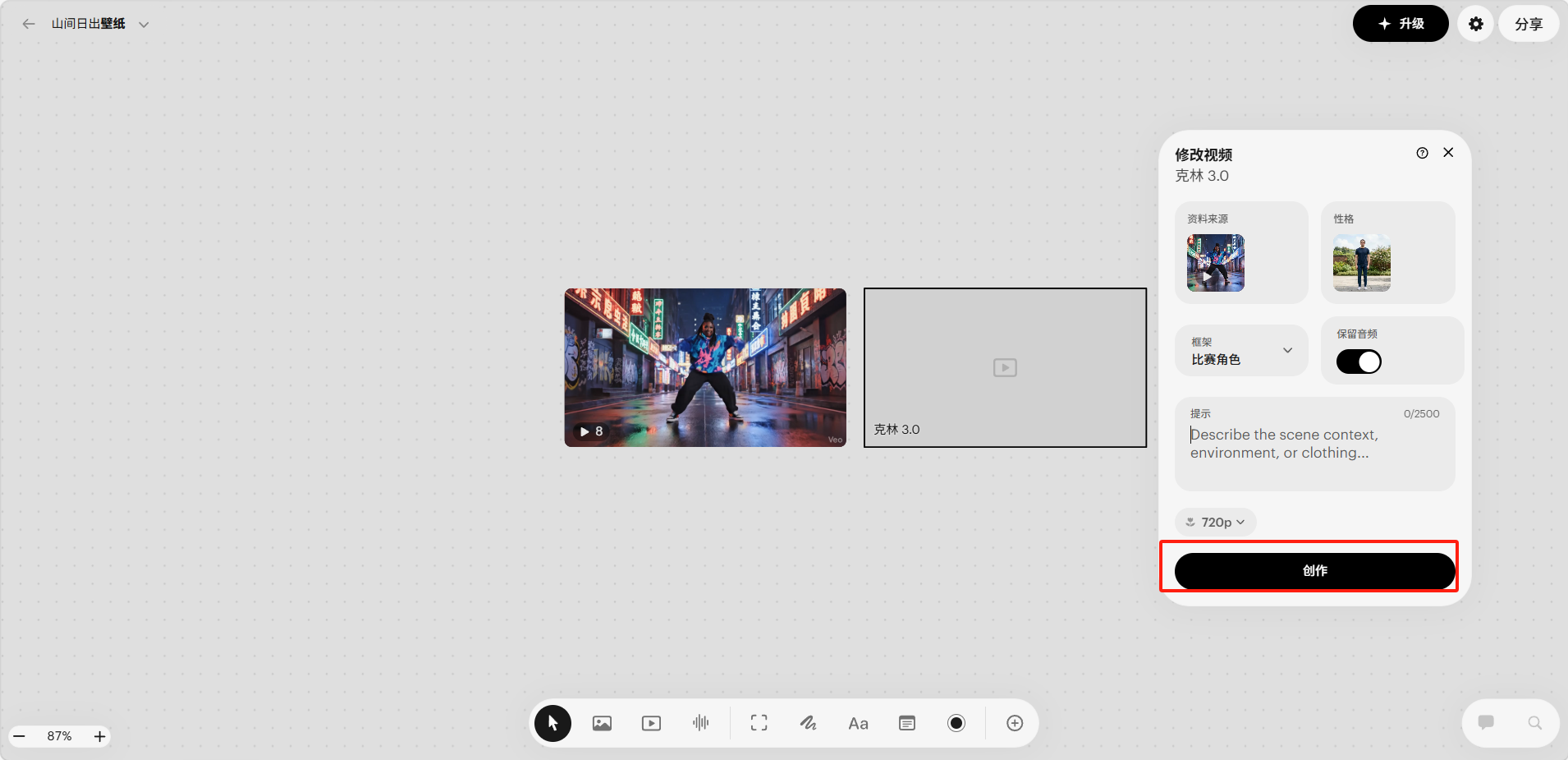 在提示词中描述场景和动作,无需重复描述角色外貌(由参考图决定)。点击「创作」。