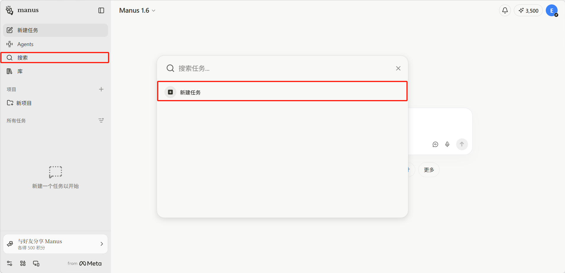 搜索面板中还提供了「新建任务」的快捷入口(带有"+"图标),方便在搜索的同时快速开启新任务,无需返回主界面。