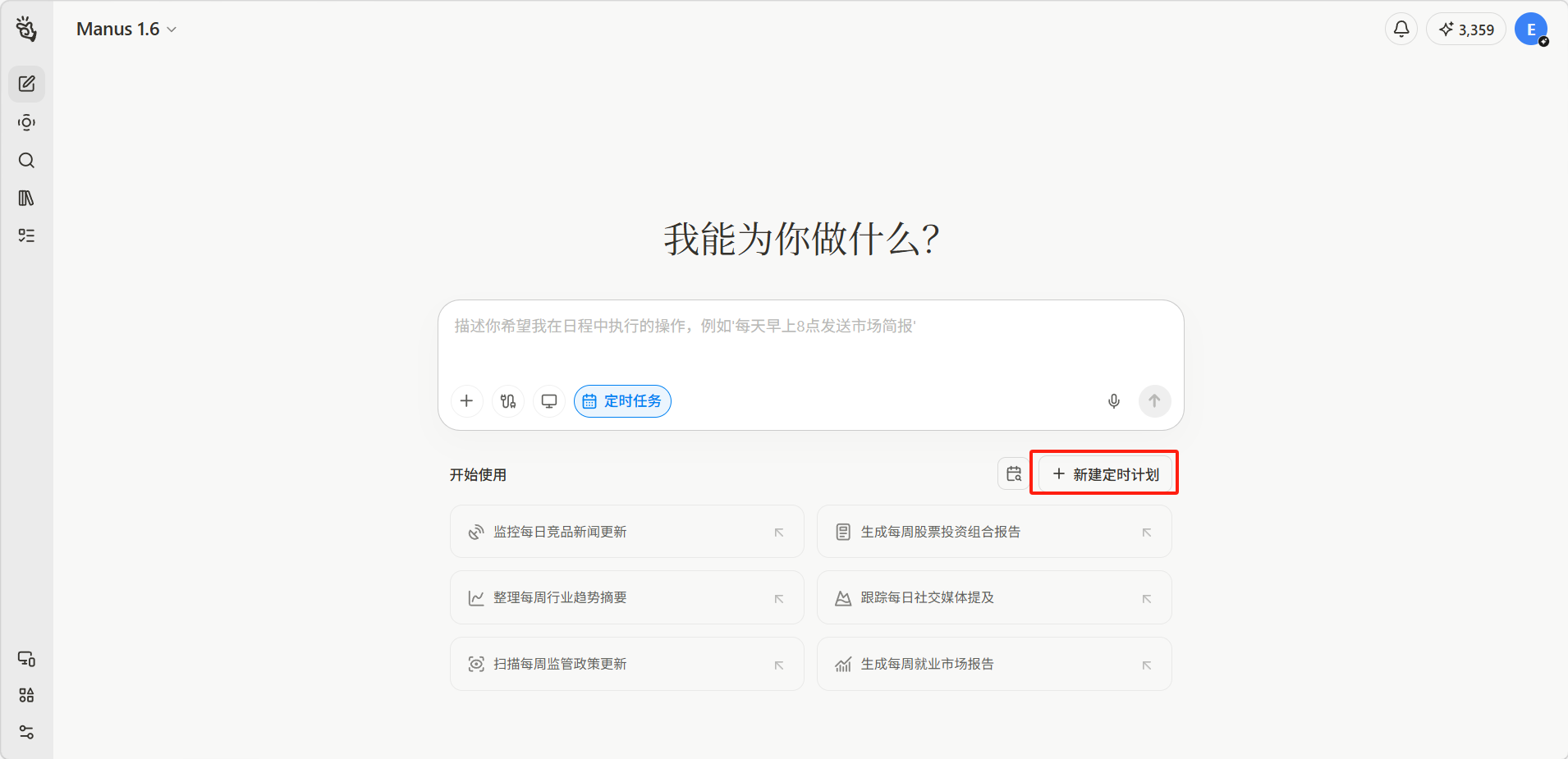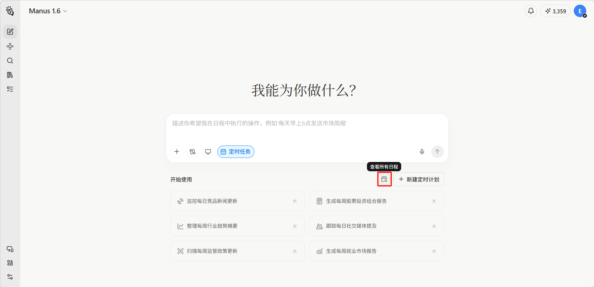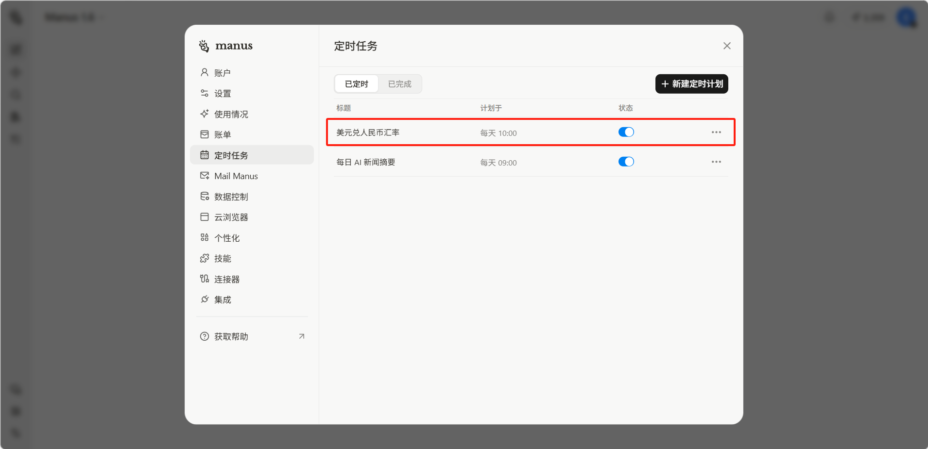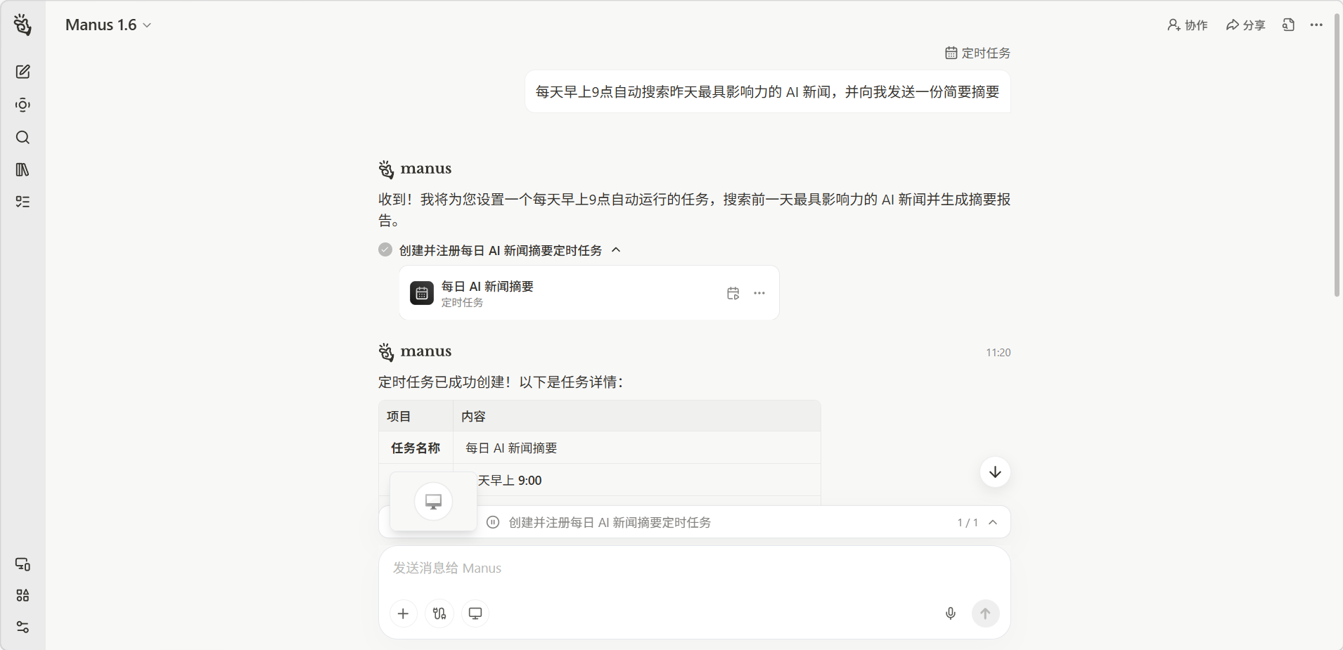 定时任务功能可以预先设定 Manus 在指定时间自动执行的任务,非常适合需要定期重复执行的工作流程。你可以设置一次性任务或周期性重复任务,Manus 会在设定的时间自动启动执行并在完成后通知你。