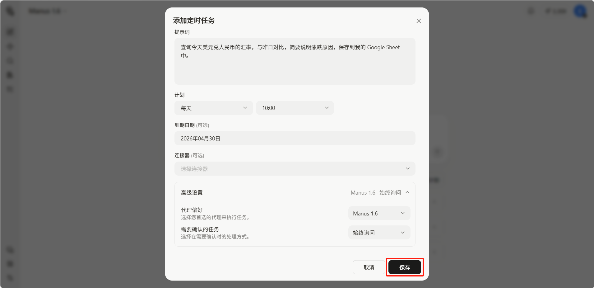 设置好任务标题、提示词、计划、到期日期(可选)、连接器(可选)、高级设置后点击保存。