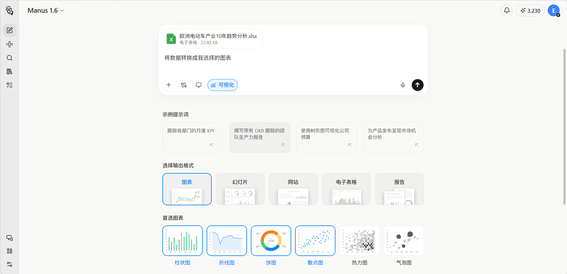 上传文件后选择输出方式和首选图表,或直接在对话框输入需求。