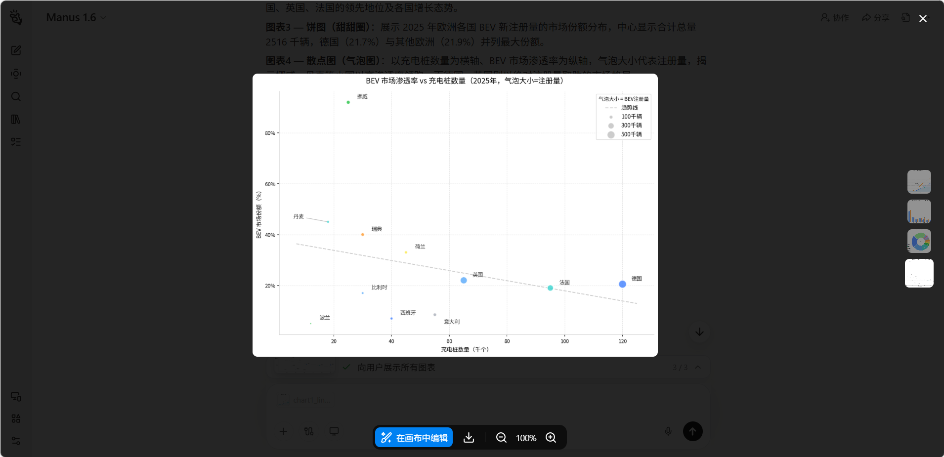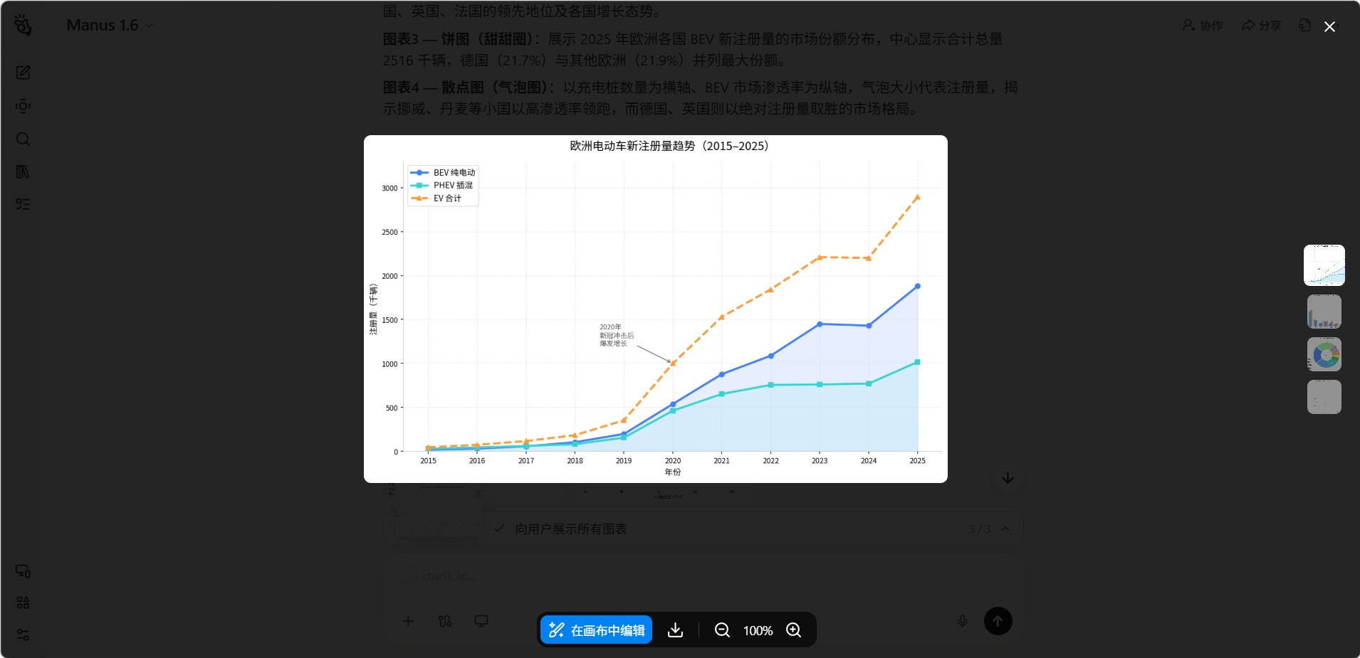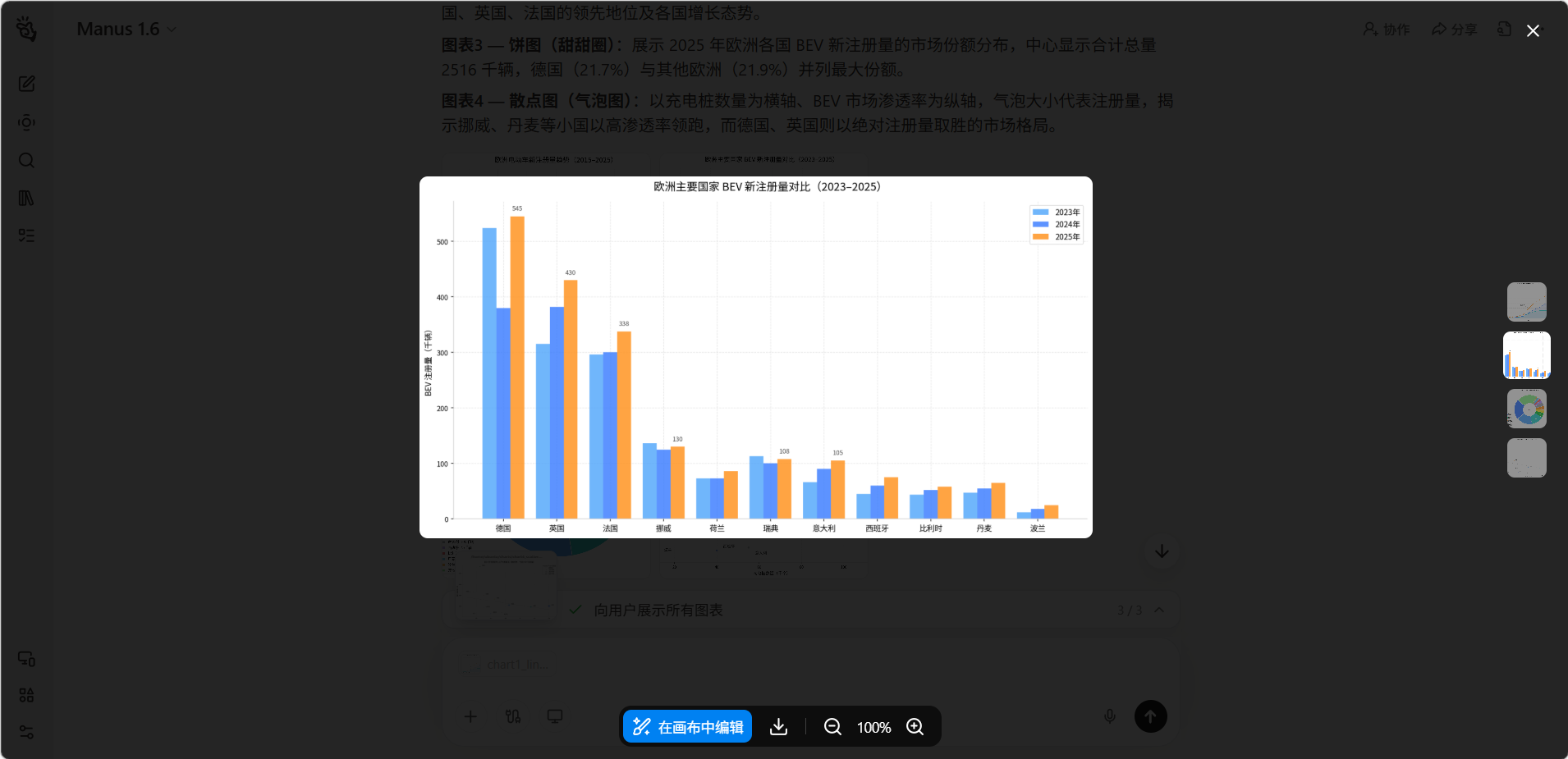「可视化」功能让你可以将数据转化为直观、美观的图表和可视化面板。无论是简单的柱状图还是复杂的交互式数据仪表盘,Manus 都能根据你的数据和需求自动生成。生成的可视化内容可以嵌入网页、导出为图片或整合到报告中。