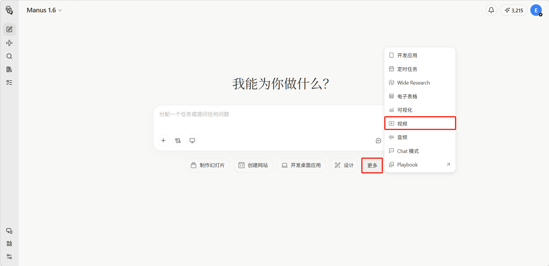 点击「更多」按钮选择「视频」,用文字描述你想要生成的视频内容。