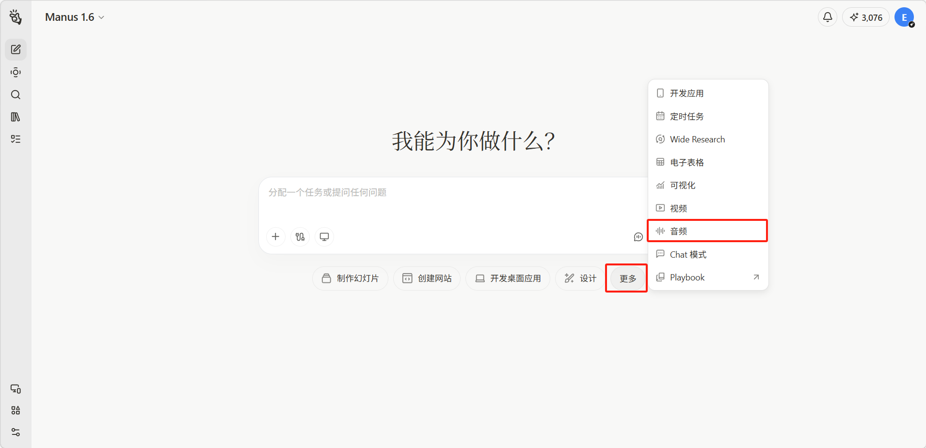 Manus 的音频功能可以处理和生成音频内容,包括文字转语音、音频转录等能力。你可以用它来为幻灯片生成配音、将音频内容转化为文字、或者创作简单的音频素材。