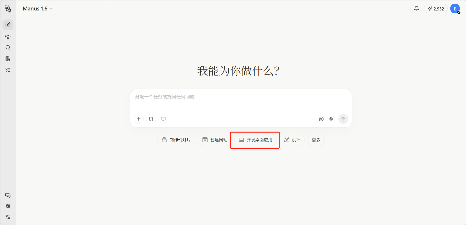 下载Manus桌面应用。点击主界面底部的「开发桌面应用」按钮,或在输入框中描述需求。