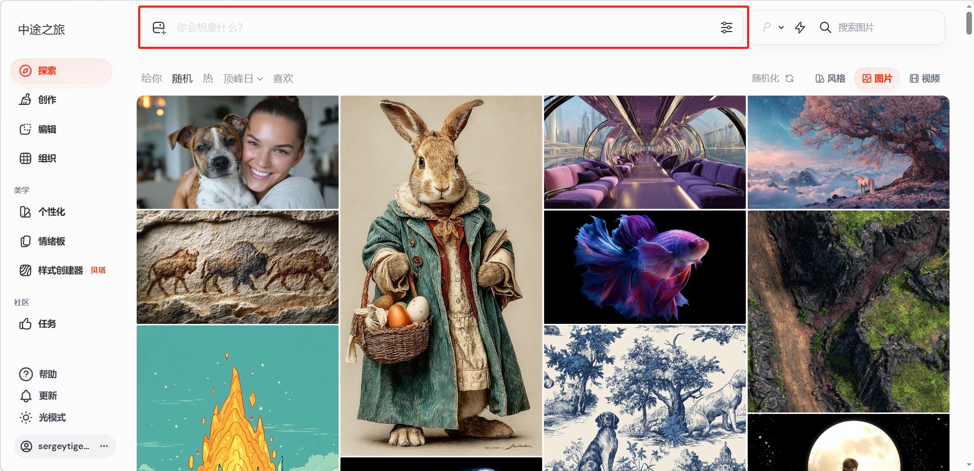 登录 Midjourney 后,页面顶部有一个提示词输入栏(Imagine 栏),这就是用户与 Midjourney 交互的核心入口。