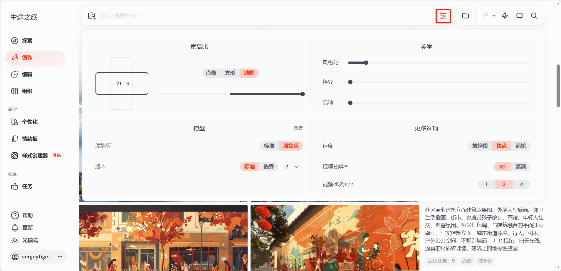 - 美学参数:风格化(Stylize)、怪异度(Weird)、品种(Variety)的滑块