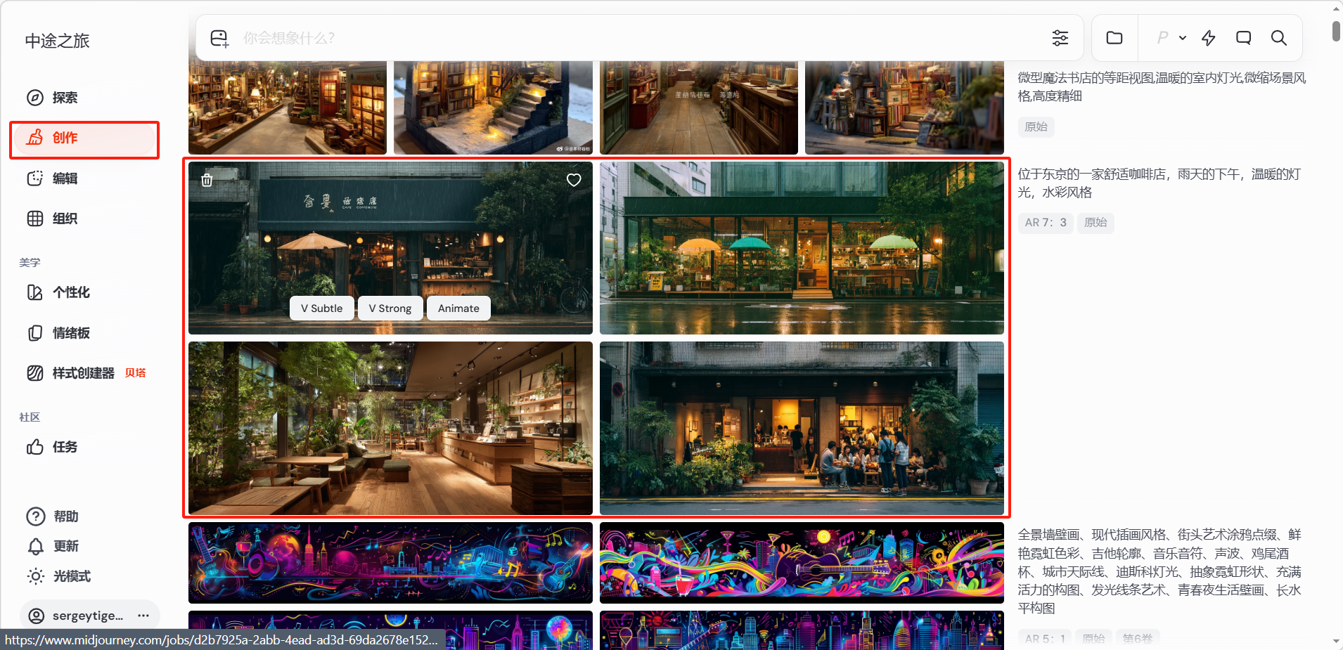 在 Imagine 栏中输入用户想生成的画面描述,然后按下回车键。Midjourney 会为用户生成一组四张图片(即一个"图片网格")。生成的图片可以在「创作」页面找到。