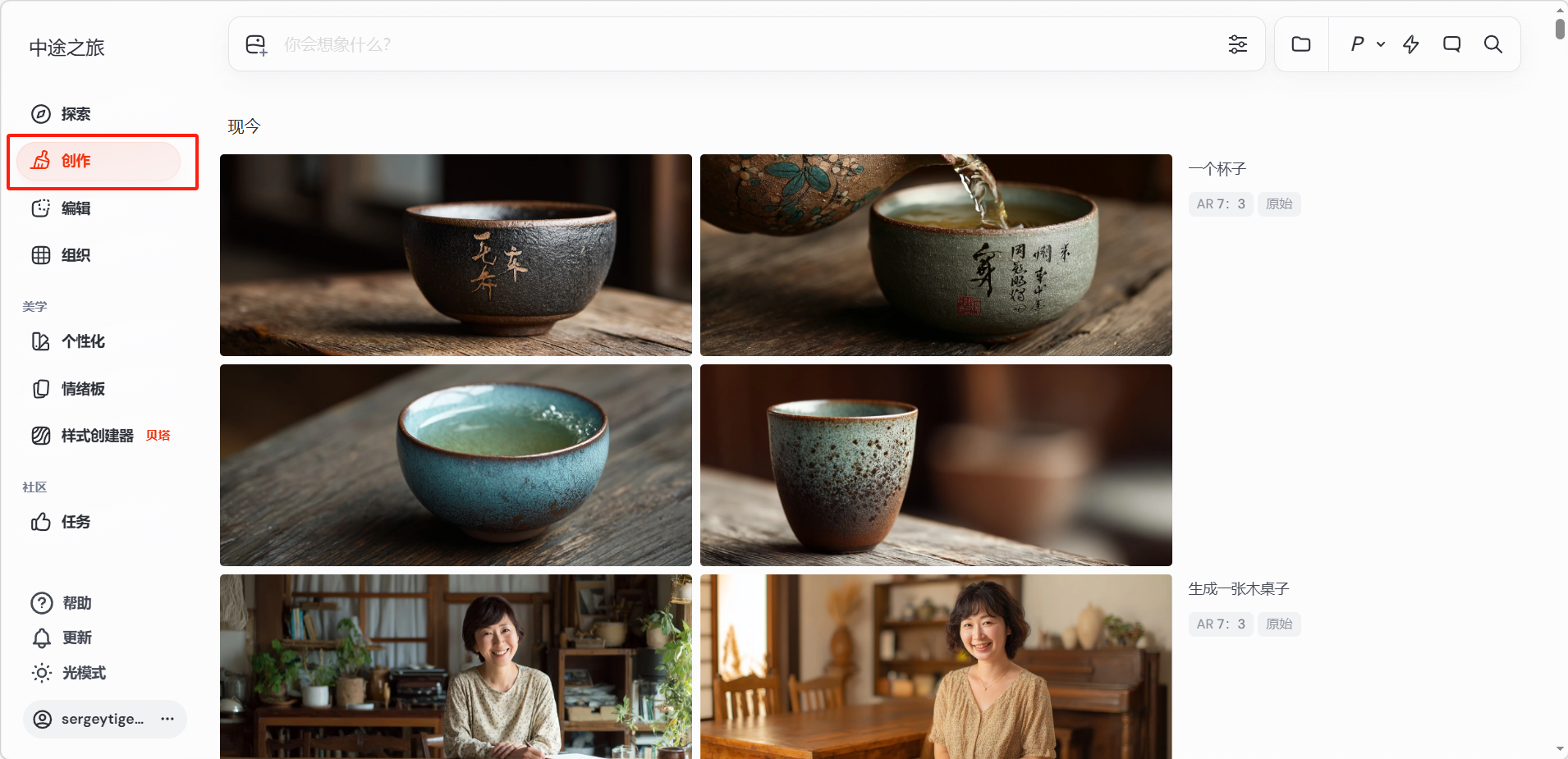 创作页面是用户的实时创作工作台。在这里用户可以看到正在生成的图片和最近完成的作品,可以对每张图片执行变体、放大、编辑等操作。图片右侧会显示该图的提示词和所用参数。