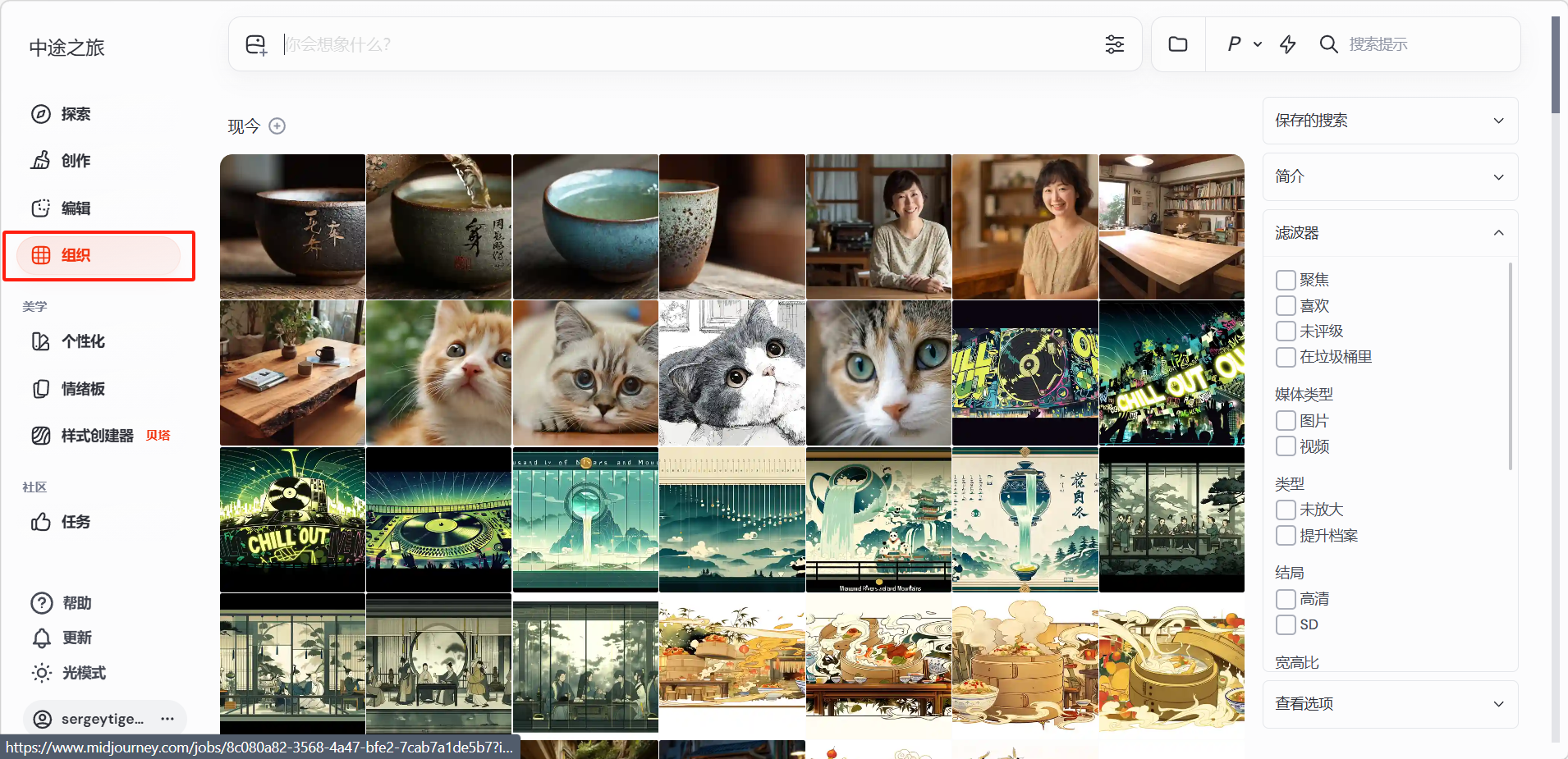 点击左侧边栏的「组织」进入作品管理页面。这里展示用户所有生成过的图片,支持以下操作: