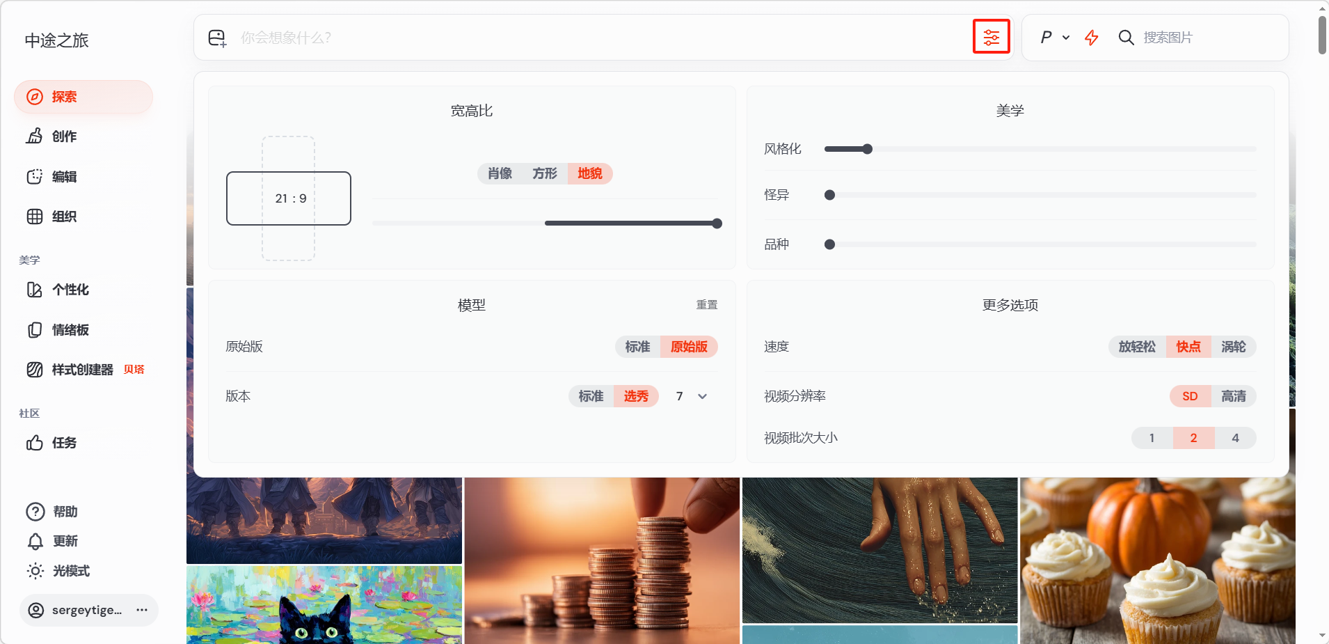 在网页端的设置面板中,用户可以预先配置常用的默认参数(如宽高比、Raw 模式、版本号、草稿模式、风格化强度等),这样每次生成时就不需要重复输入这些参数。