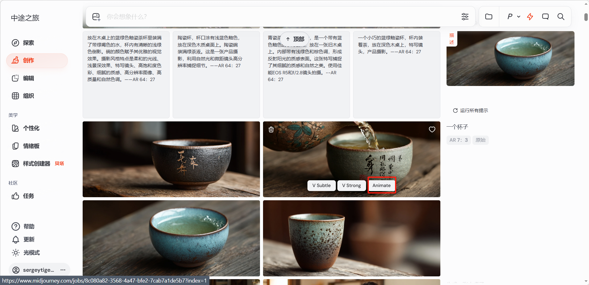 在单张图片的操作面板中点击「Animate」按钮即可启动视频生成。