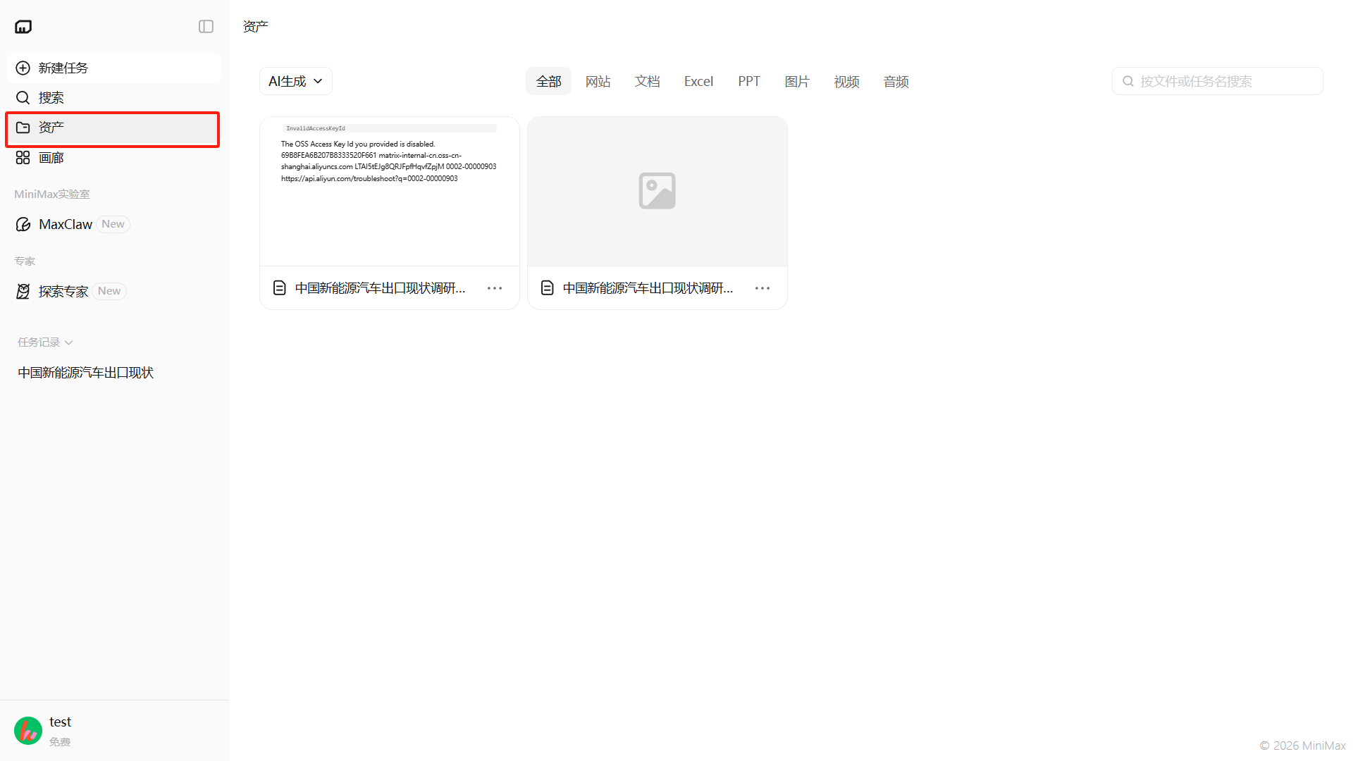 左侧边栏的「资产」功能用于管理你在 MiniMax 中的各类文件资源。上传到资产中的文件可以在任务中引用,无需每次重新上传。