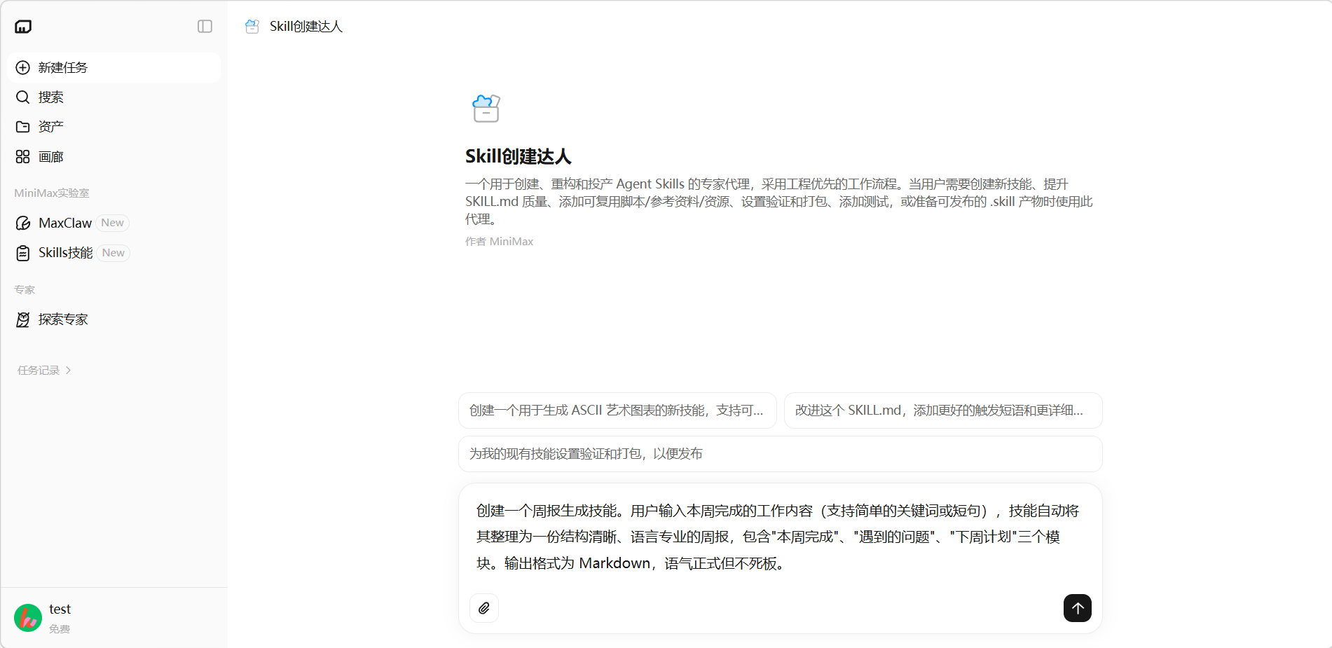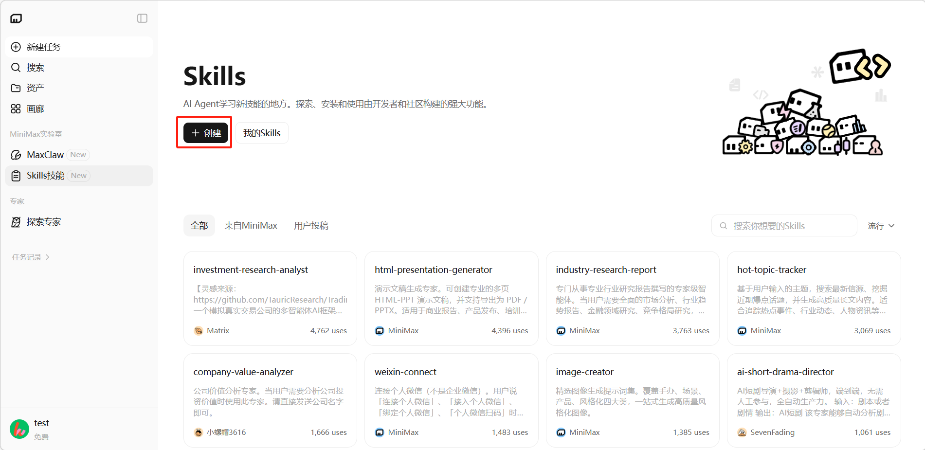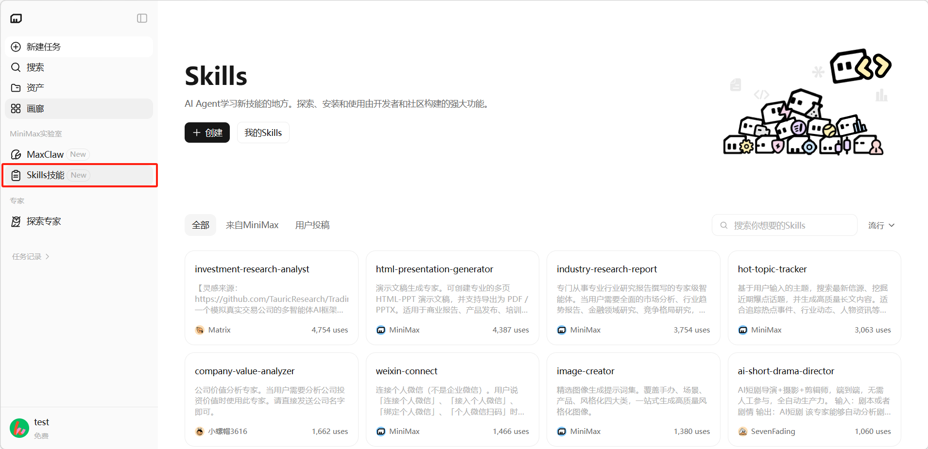 Skills 技能是 MiniMax Agent 的能力扩展中心。类似于应用商店,你可以在这里发现、安装和使用各种预制的专业技能。并且MiniMax支持一句话创建Skills,创建完成后还可以发布自己的Skills到社区。