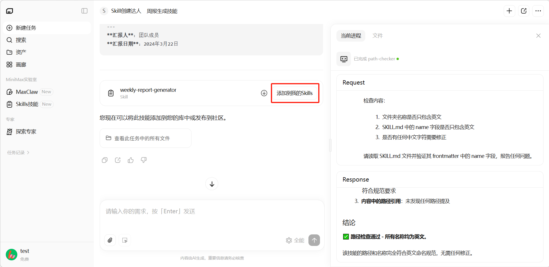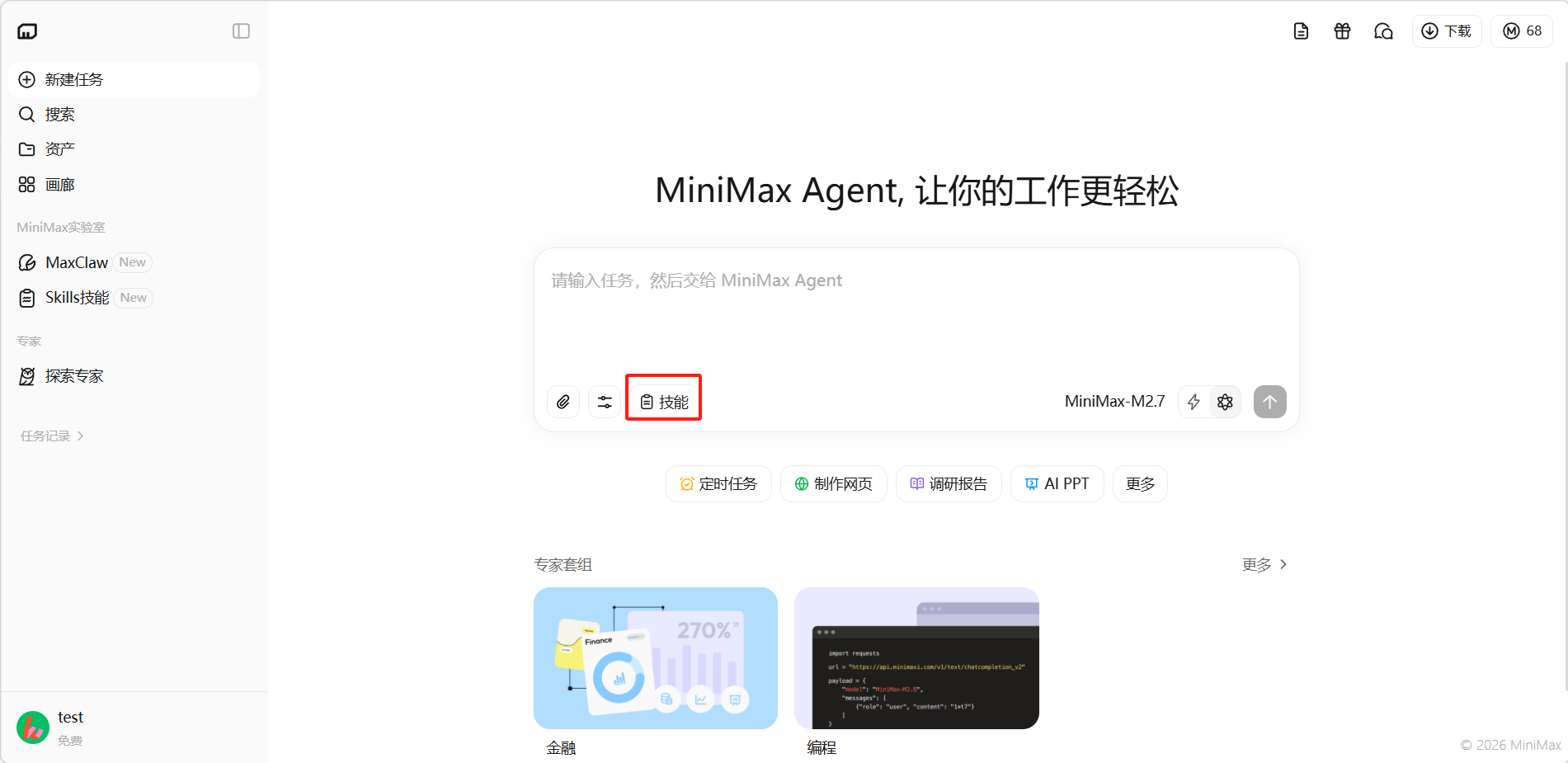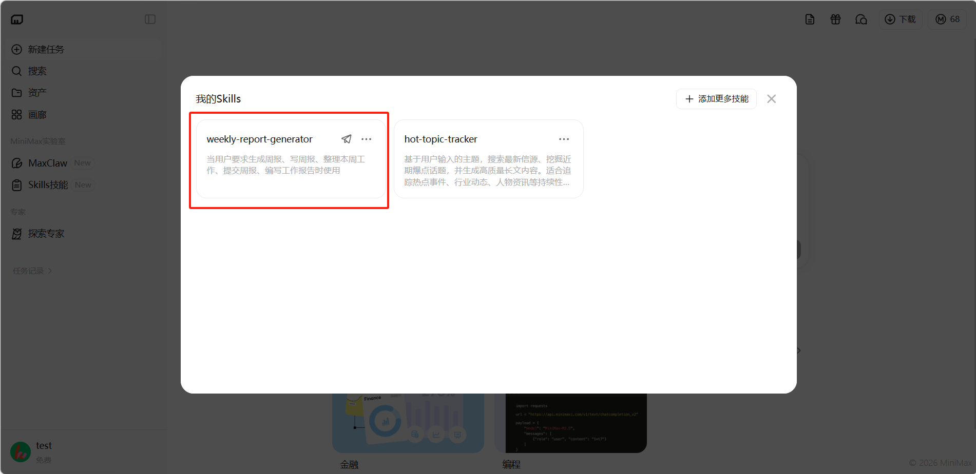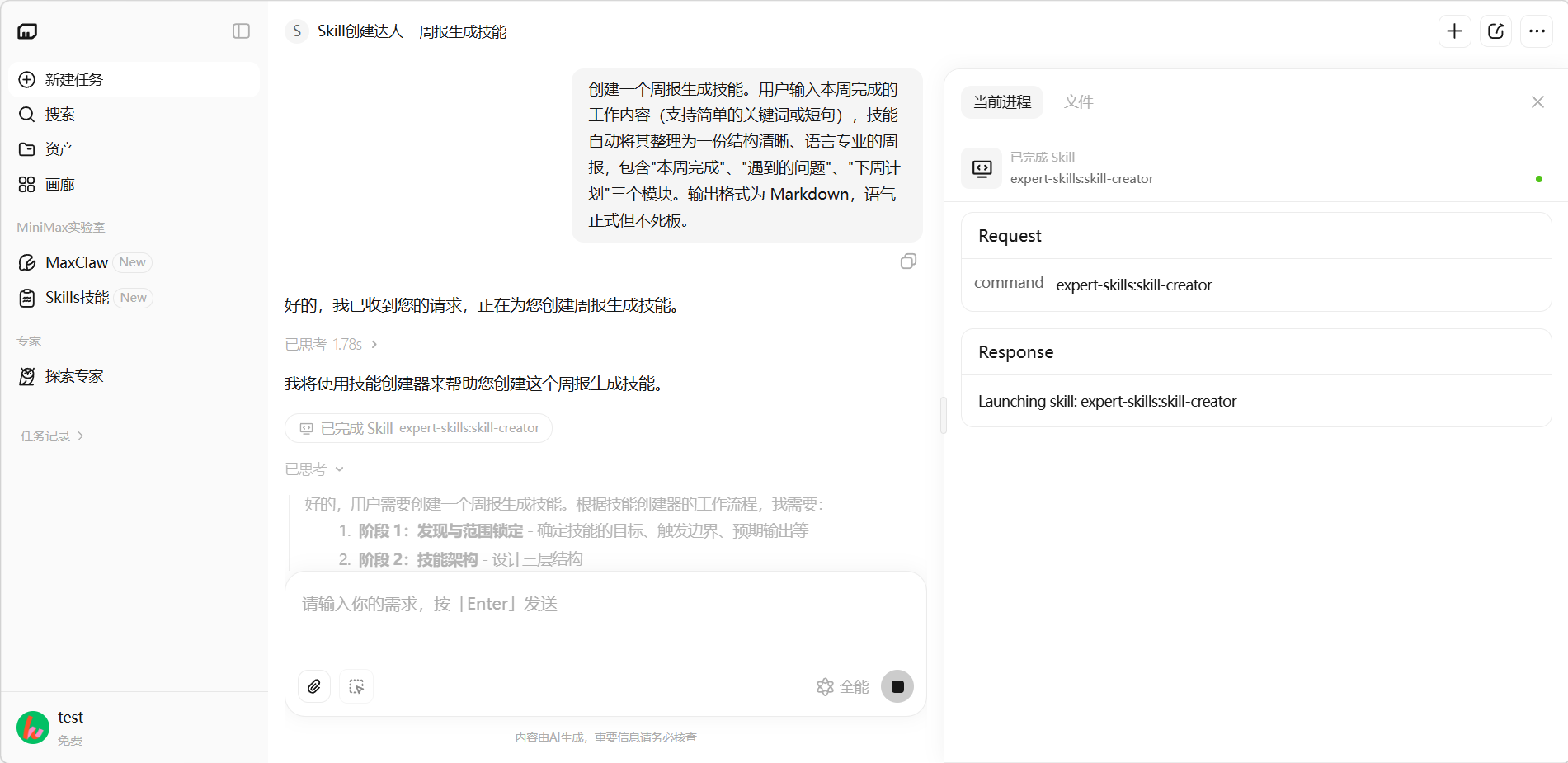 Skills 技能是 MiniMax Agent 的能力扩展中心。类似于应用商店,你可以在这里发现、安装和使用各种预制的专业技能。并且MiniMax支持一句话创建Skills,创建完成后还可以发布自己的Skills到社区。