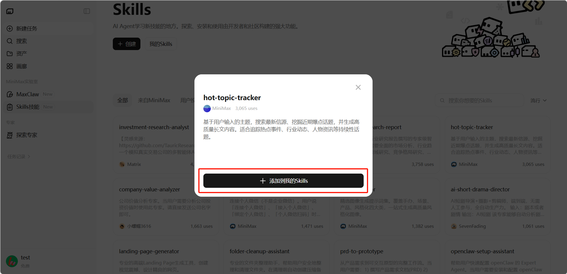 在技能页面浏览或搜索你需要的技能,点击「添加到我的Skills 」。