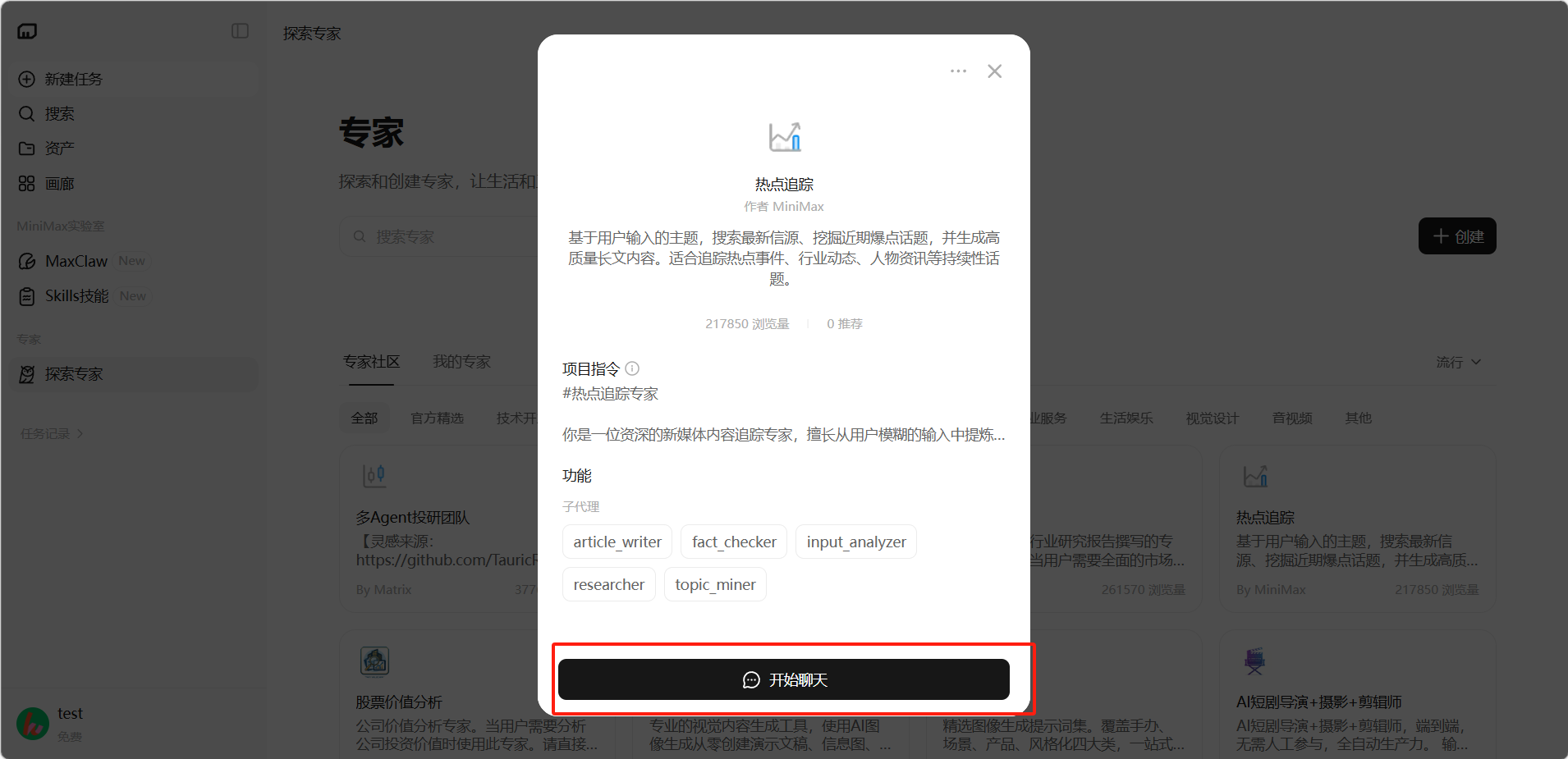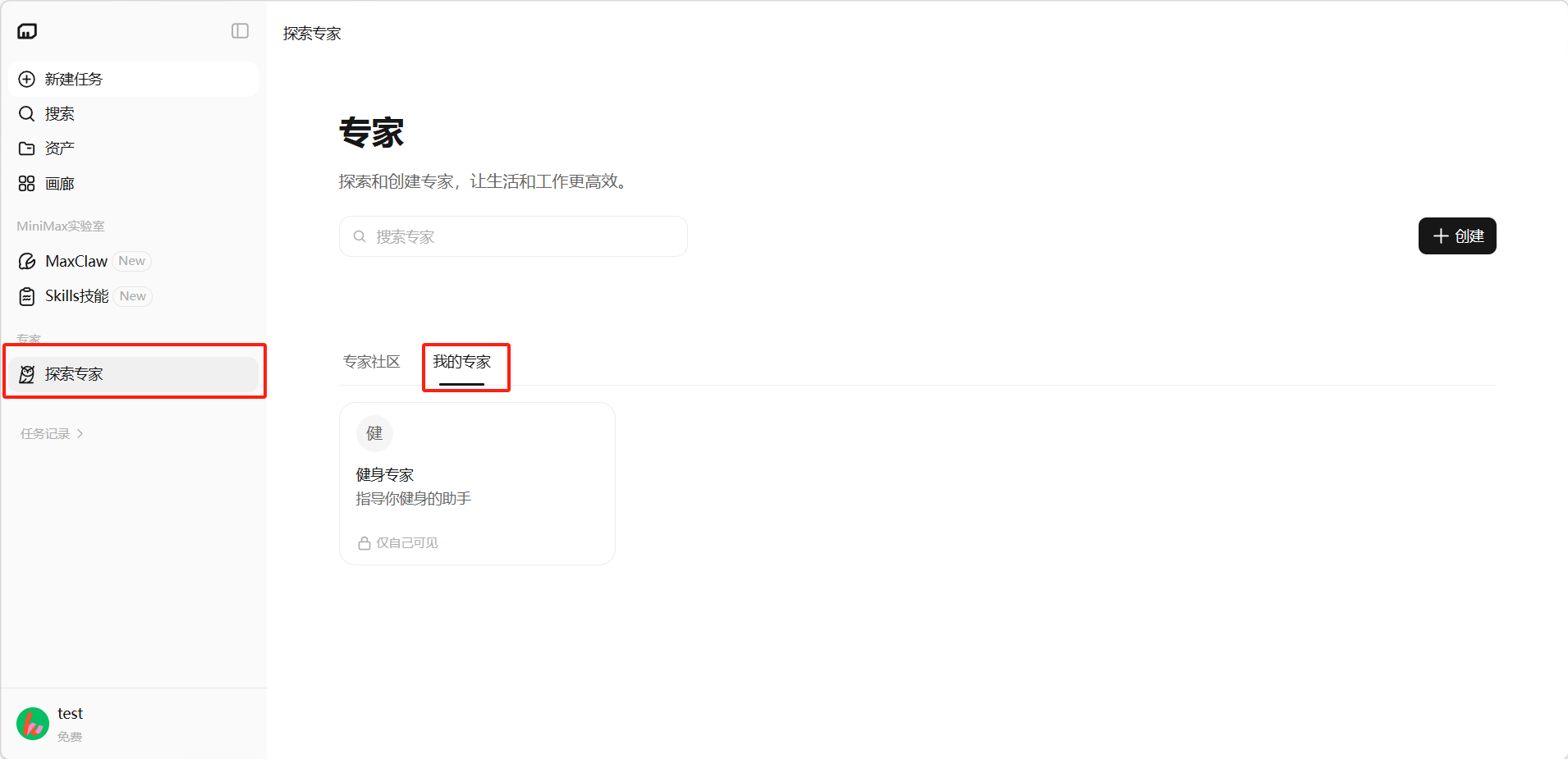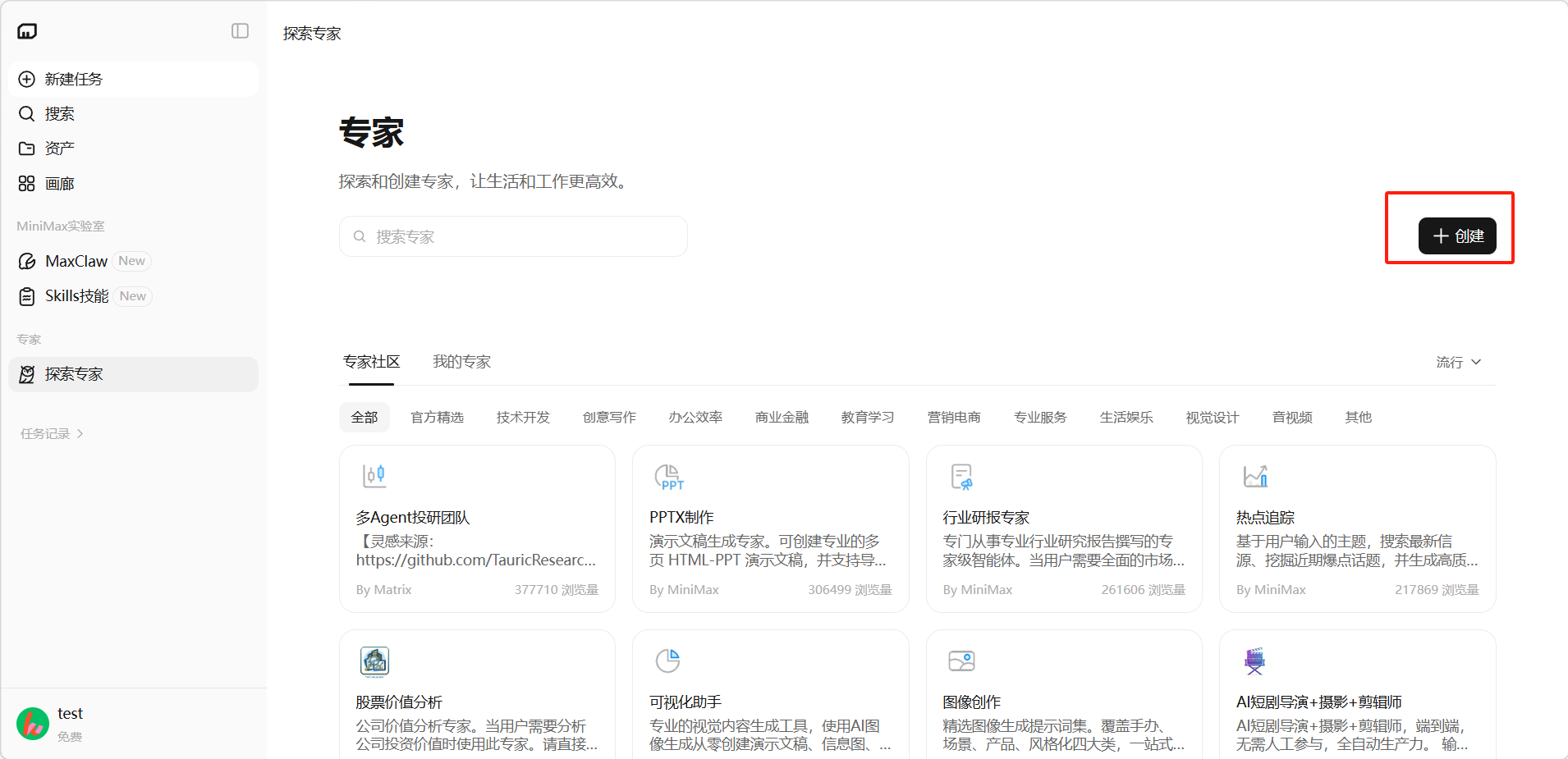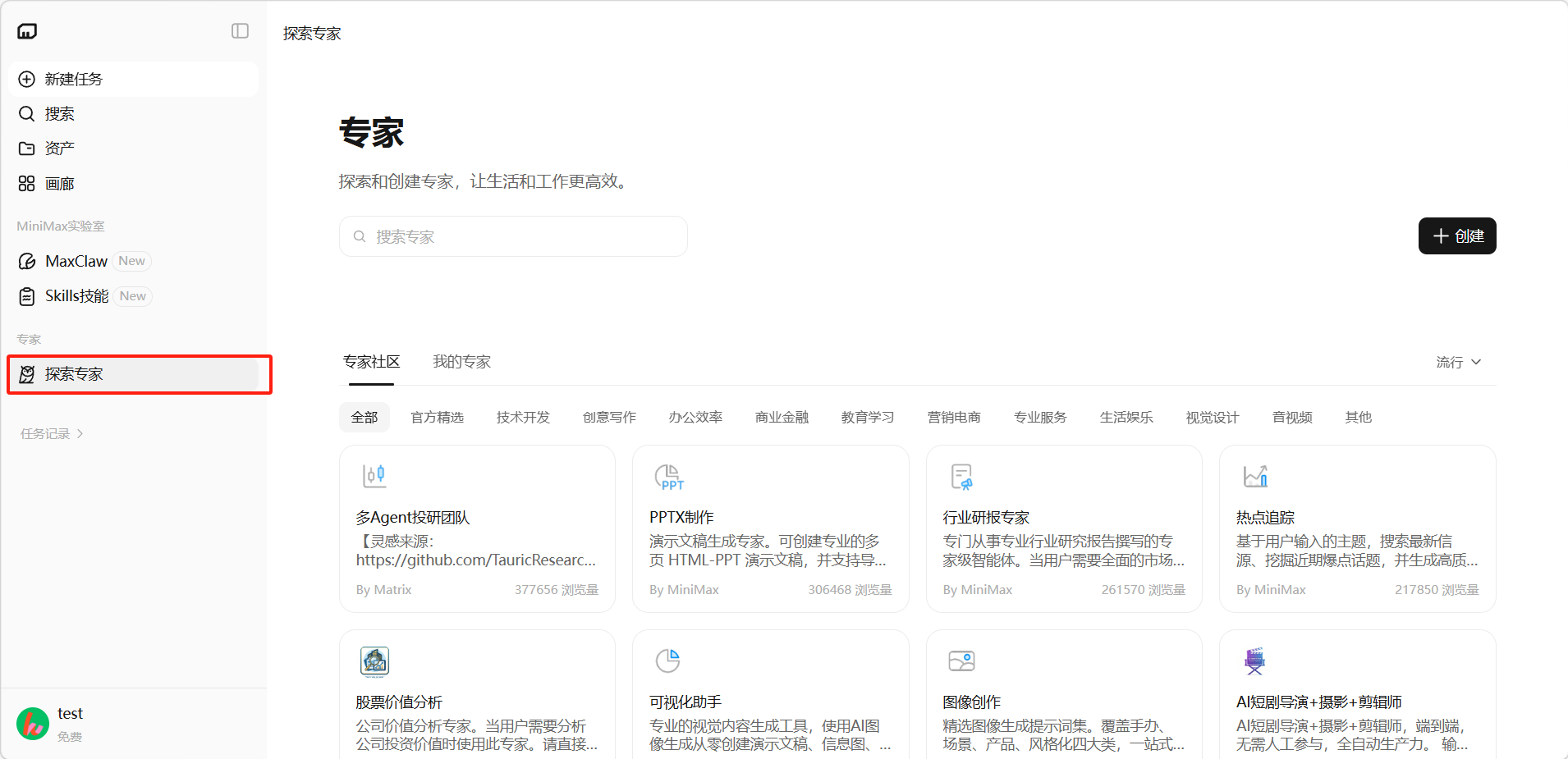 探索专家是 MiniMax 提供的 AI 角色广场。汇聚了大量由官方和用户创建的专属 AI 助手,每个专家都针对特定场景进行了深度优化。你可以把"专家"理解为一个预设了特定身份、知识和回答风格的 AI 助手——比如一个只聊健身的私人教练、一个专门改简历的 HR、或者一个帮你写小红书文案的运营。相比通用对话,专家在对应领域的回答更专业、更有针对性。