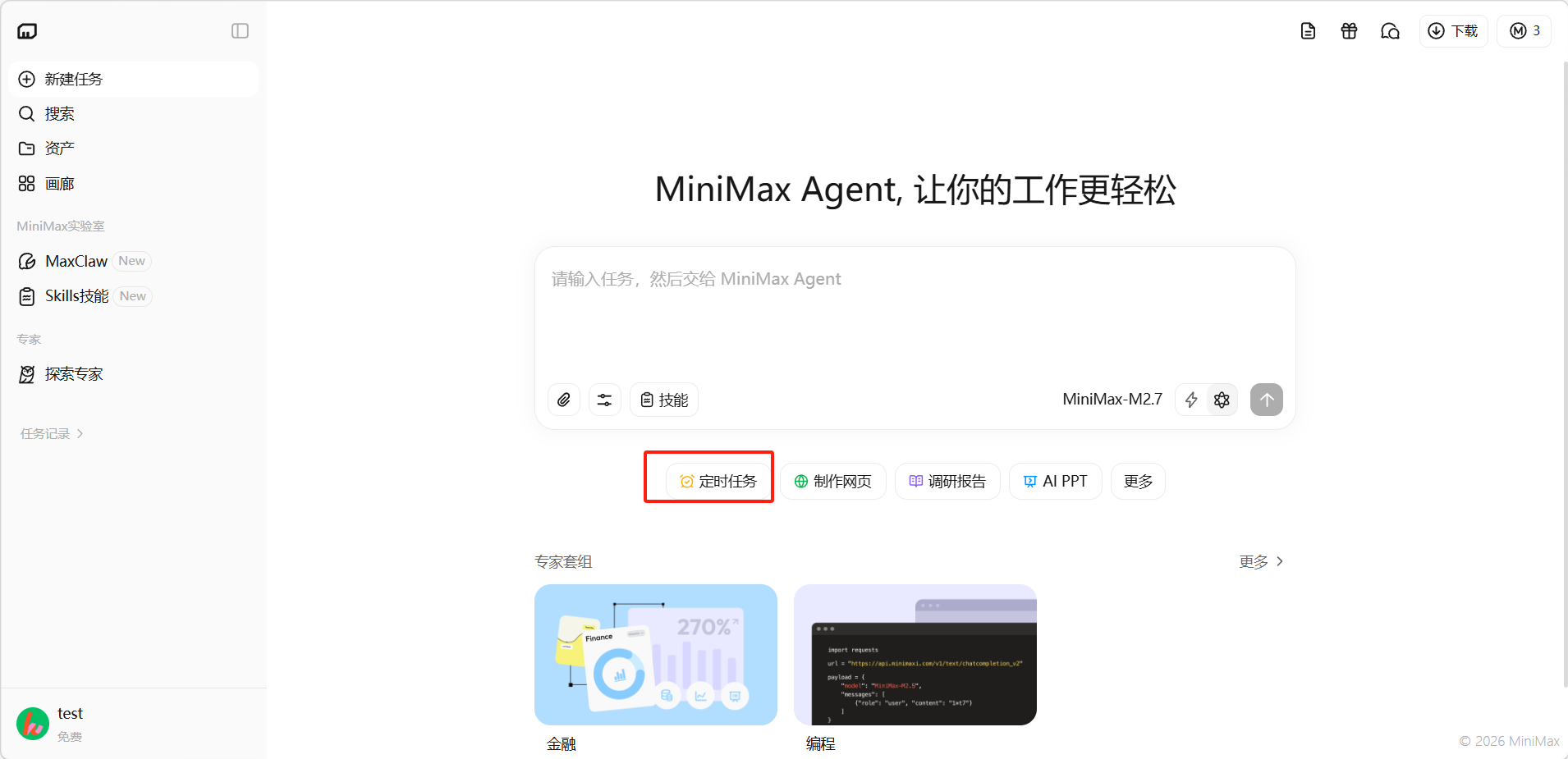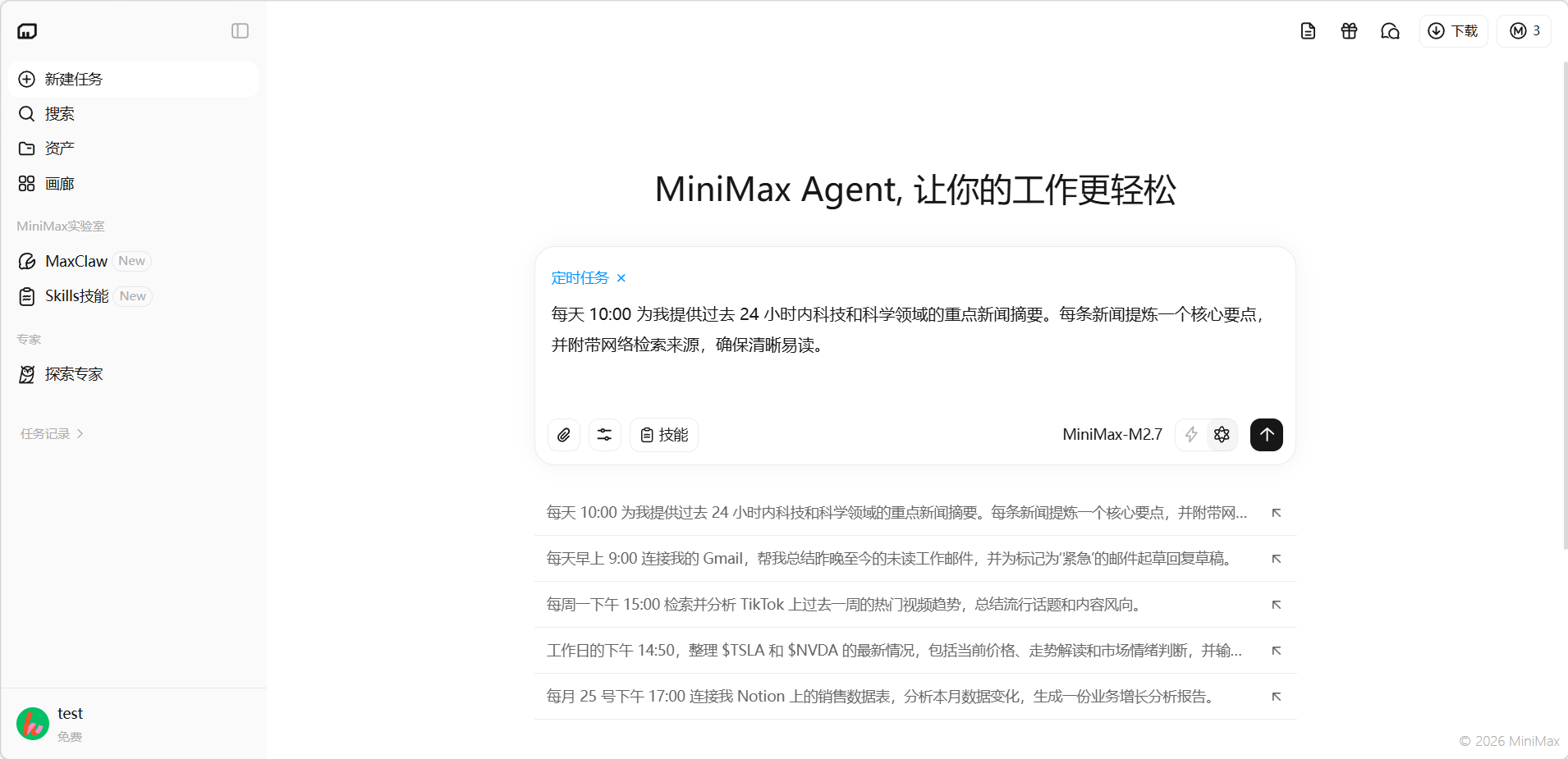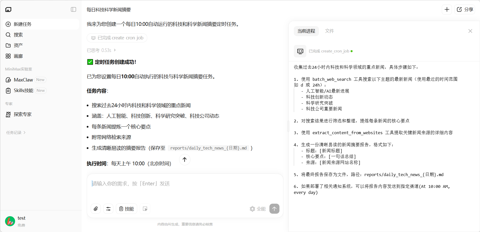 定时任务让 MiniMax Agent 可以按照你设定的时间和频率自动执行任务,相当于给 AI 设了一个闹钟。即使你不在线,Agent 也会在预定时间自动运行任务并将结果保存到你的任务记录中。