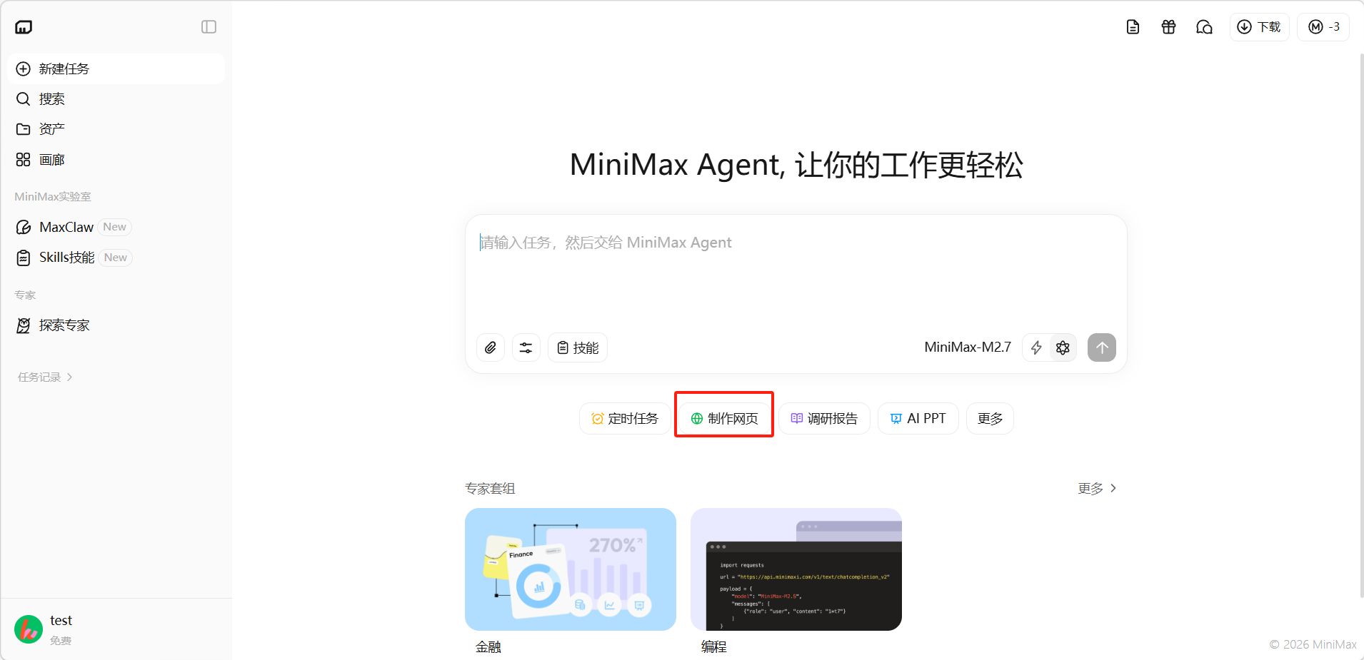 MiniMax Agent 可以根据你的自然语言描述,快速生成完整的网页应用,包括前端界面、样式设计和交互逻辑。从简单的着陆页到复杂的互动游戏,都能一句话搞定。