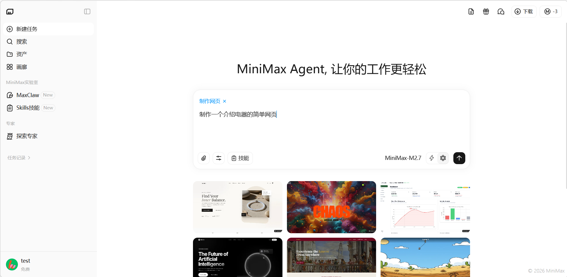 进入网页制作模式后,界面会展示一系列风格各异的网页示例模板(如品牌官网、数据看板、个人博客、游戏页面等),为你提供灵感。你可以直接在输入框中描述需求,Agent 会自动生成完整可运行的网页。