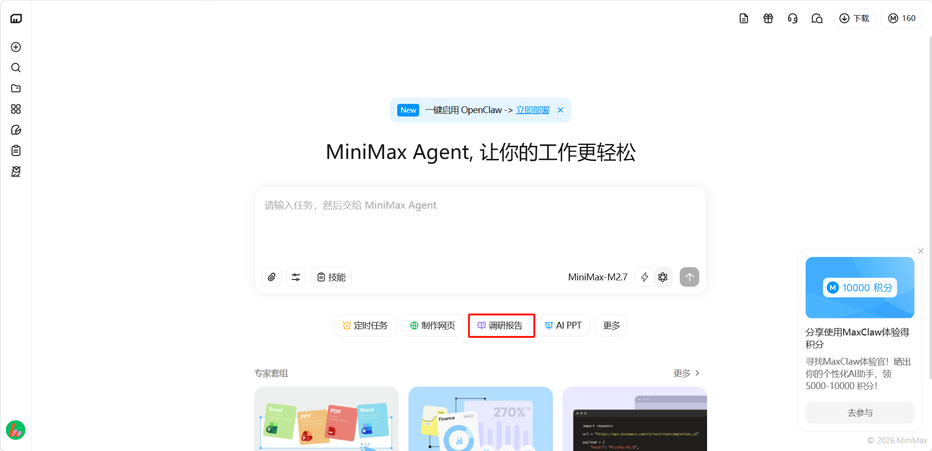 调研报告功能是 MiniMax Agent 最强大的深度研究能力。当你给出一个研究课题,Agent 会像一名专业研究员一样自主规划研究路径、联网搜索大量信息源、交叉验证数据,最终输出一份结构化的完整研究报告。