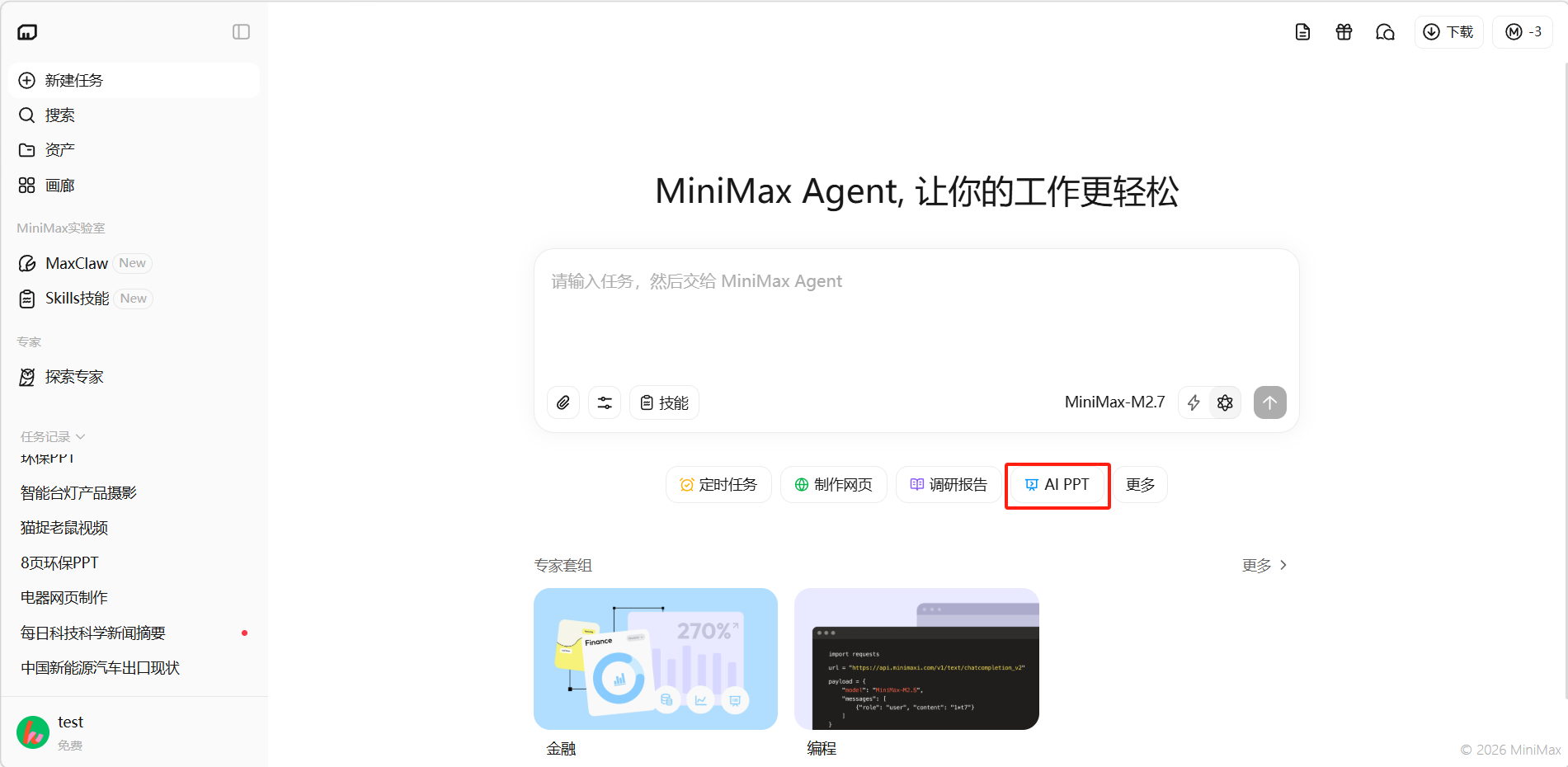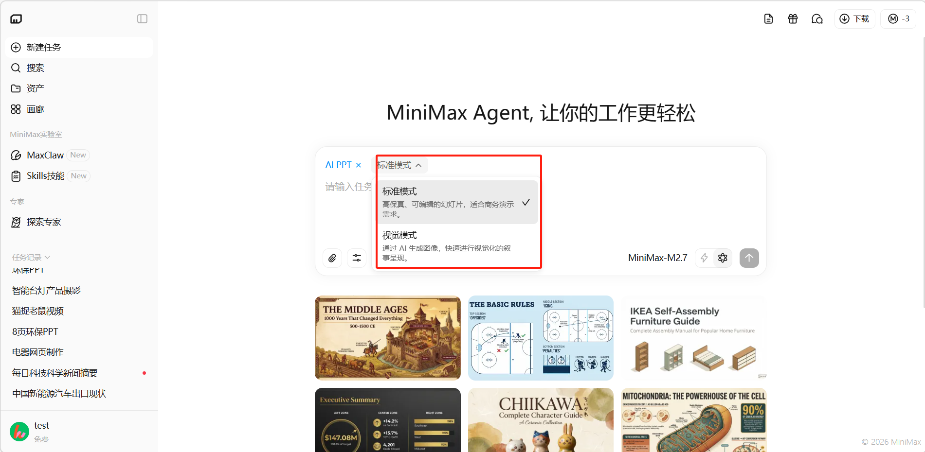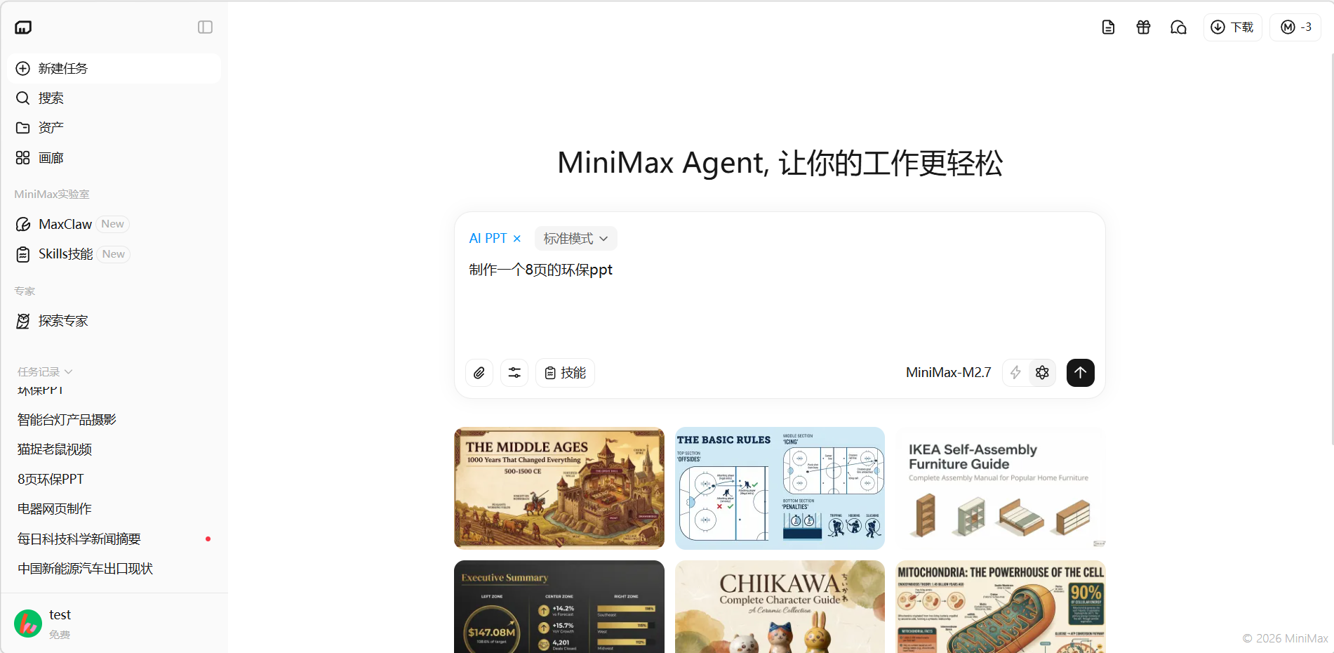 MiniMax Agent 可以通过简单的文字描述自动生成专业演示文稿,从大纲构思到视觉设计一步完成,大幅节省制作 PPT 的时间。