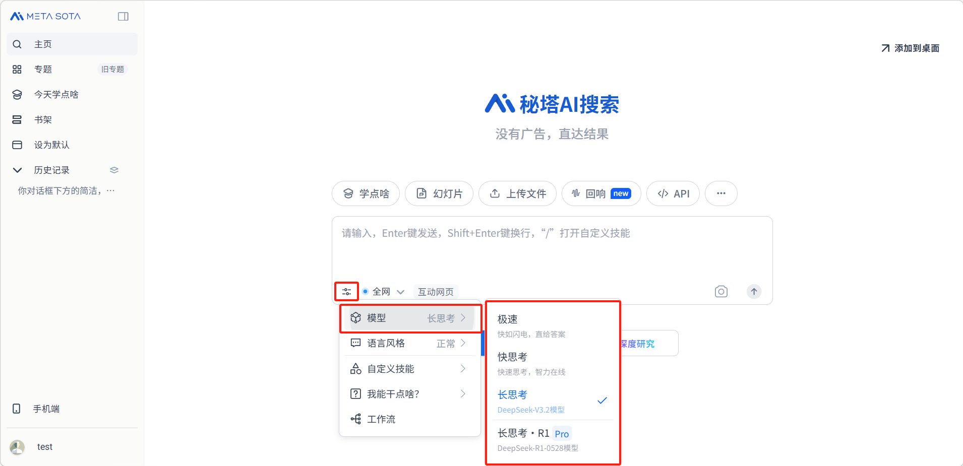 💡 建议:日常搜索使用「快思考」即可满足大部分需求。当遇到需要深度分析、逻辑推理的复杂问题时,切换到「长思考」或「长思考·R1 Pro」效果更佳。