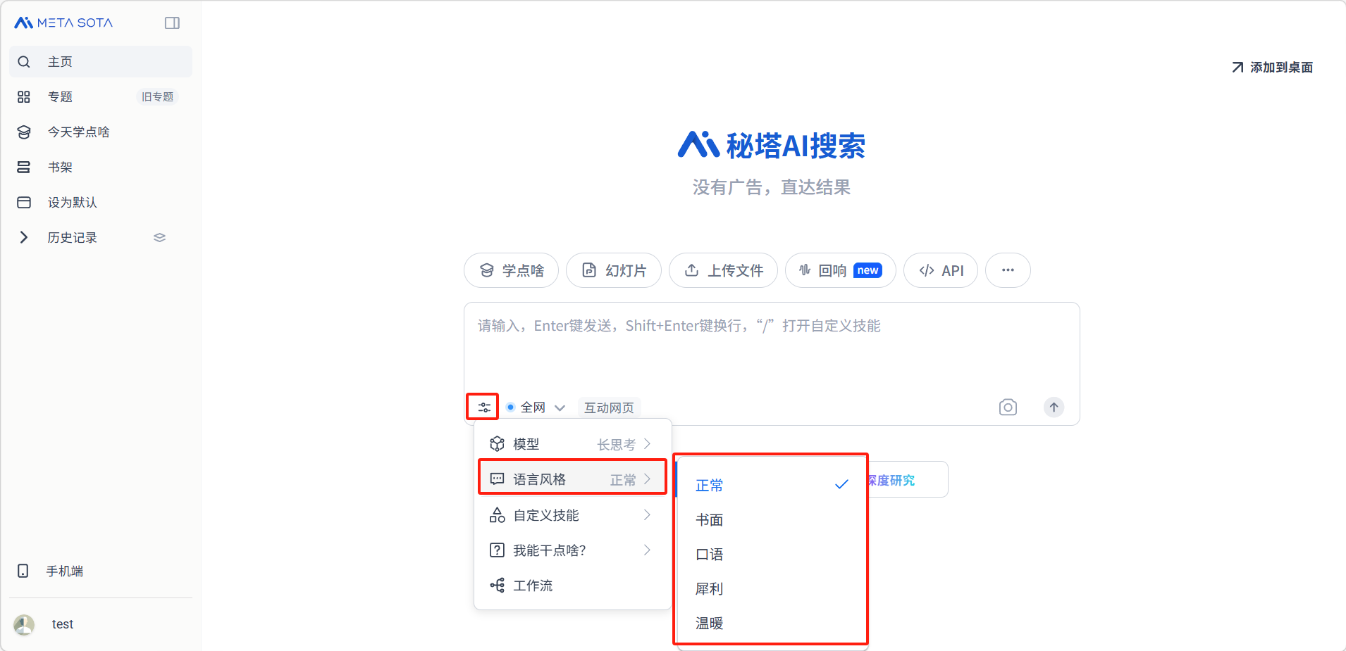 在对话框左下方设置菜单中选择「语言风格」,可以调整AI回答的语气和表达方式: