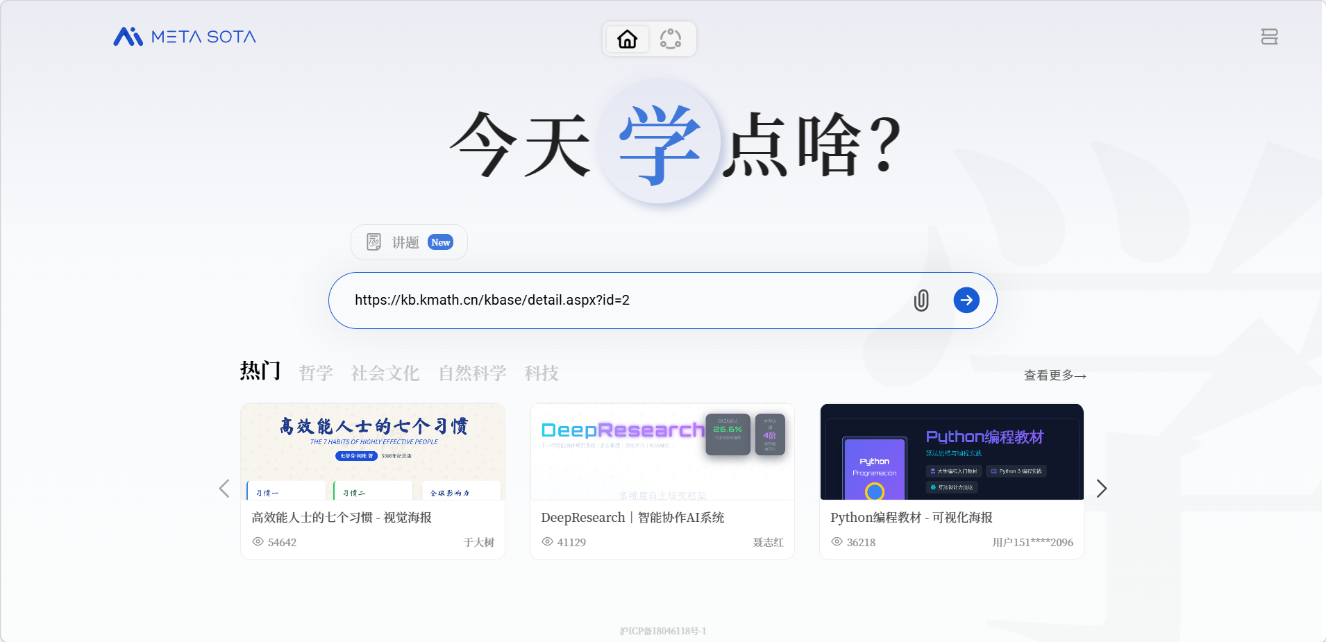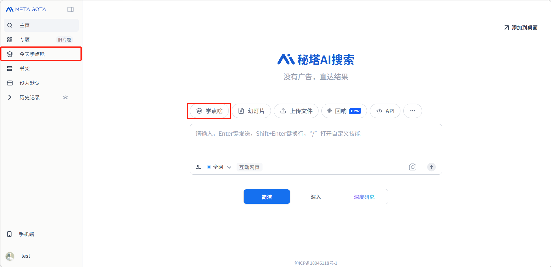 「今天学点啥」是秘塔AI搜索的一个特色学习功能。它提供了一个以文献和学术内容为核心的学习入口,帮助用户以论文和专业资料为基础,探索和学习各类知识。