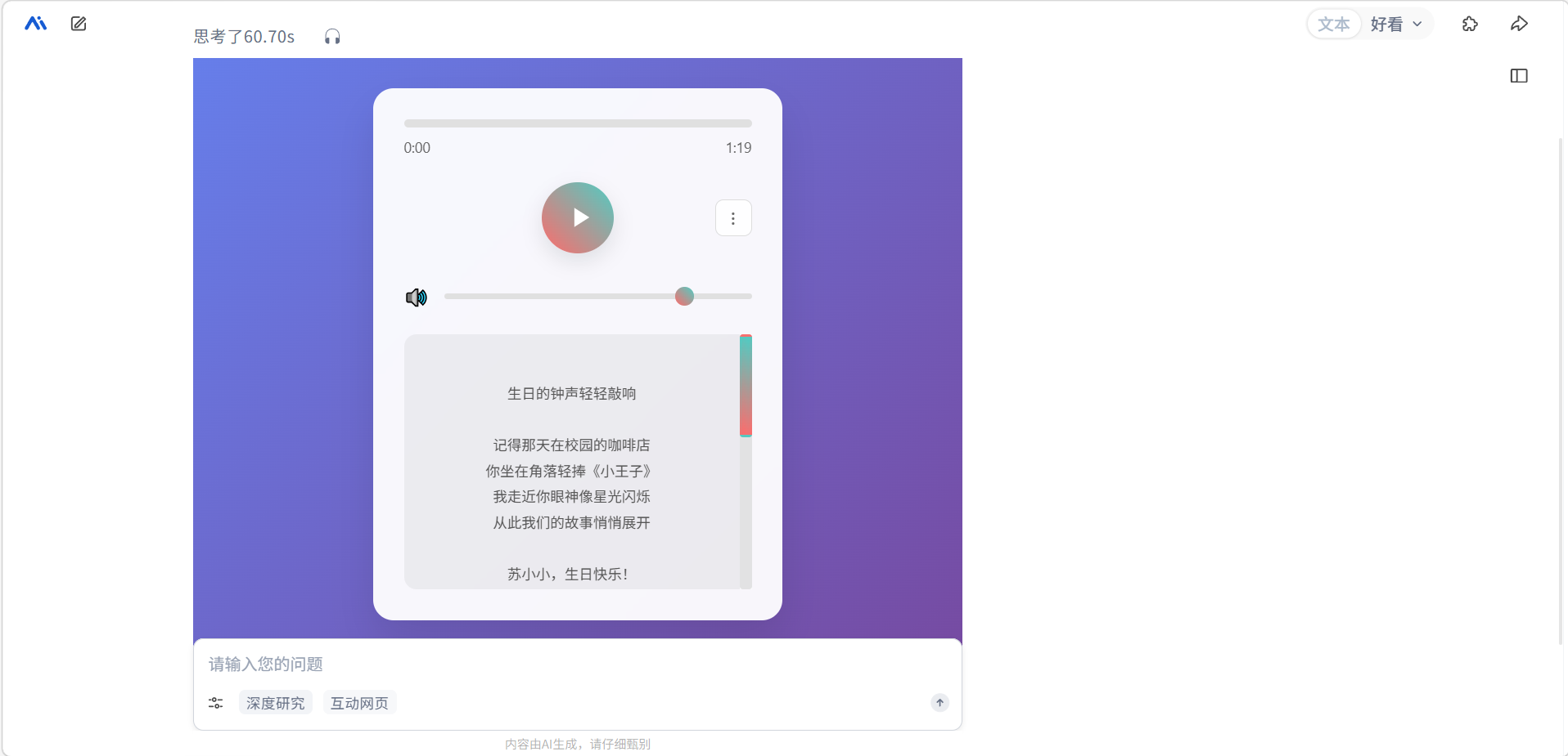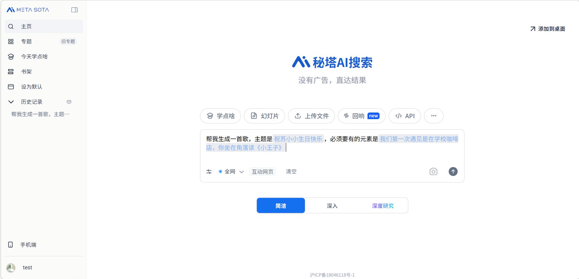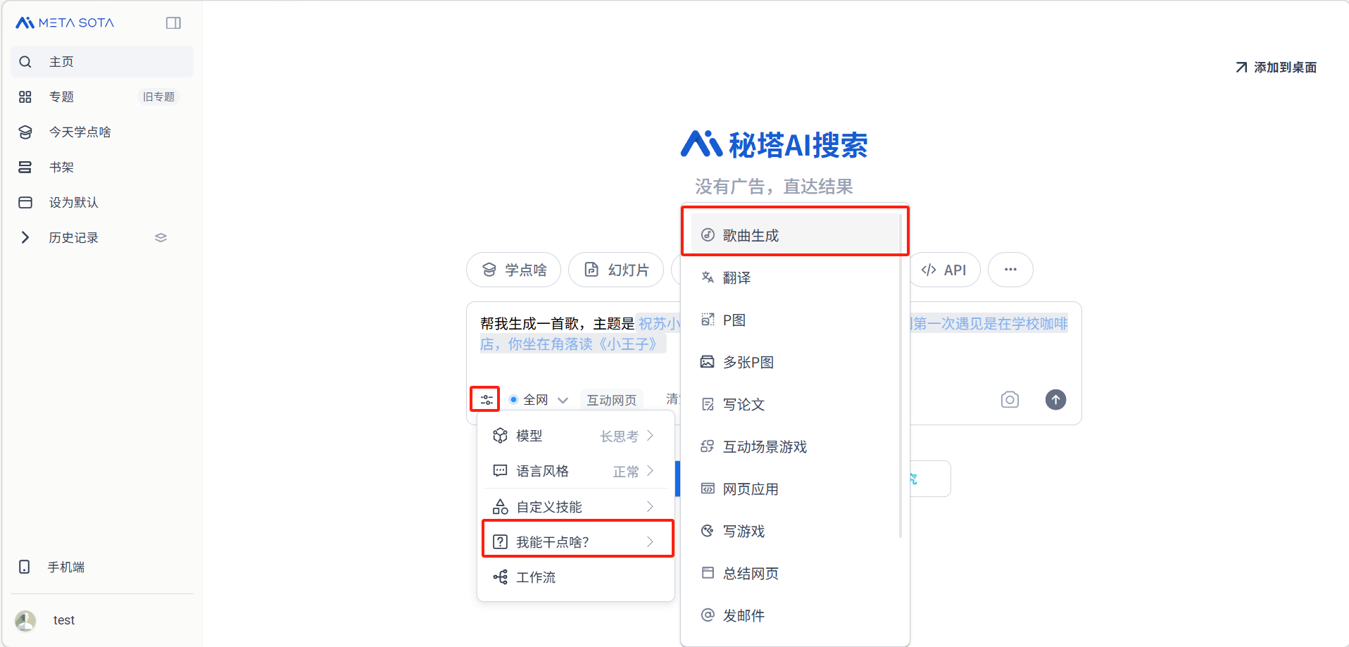 秘塔AI搜索内置了歌曲生成功能,可以根据你的描述创作原创歌曲。从歌词到旋律,AI 一站式完成,适合需要背景音乐、个性化创作或纯粹好奇的用户。