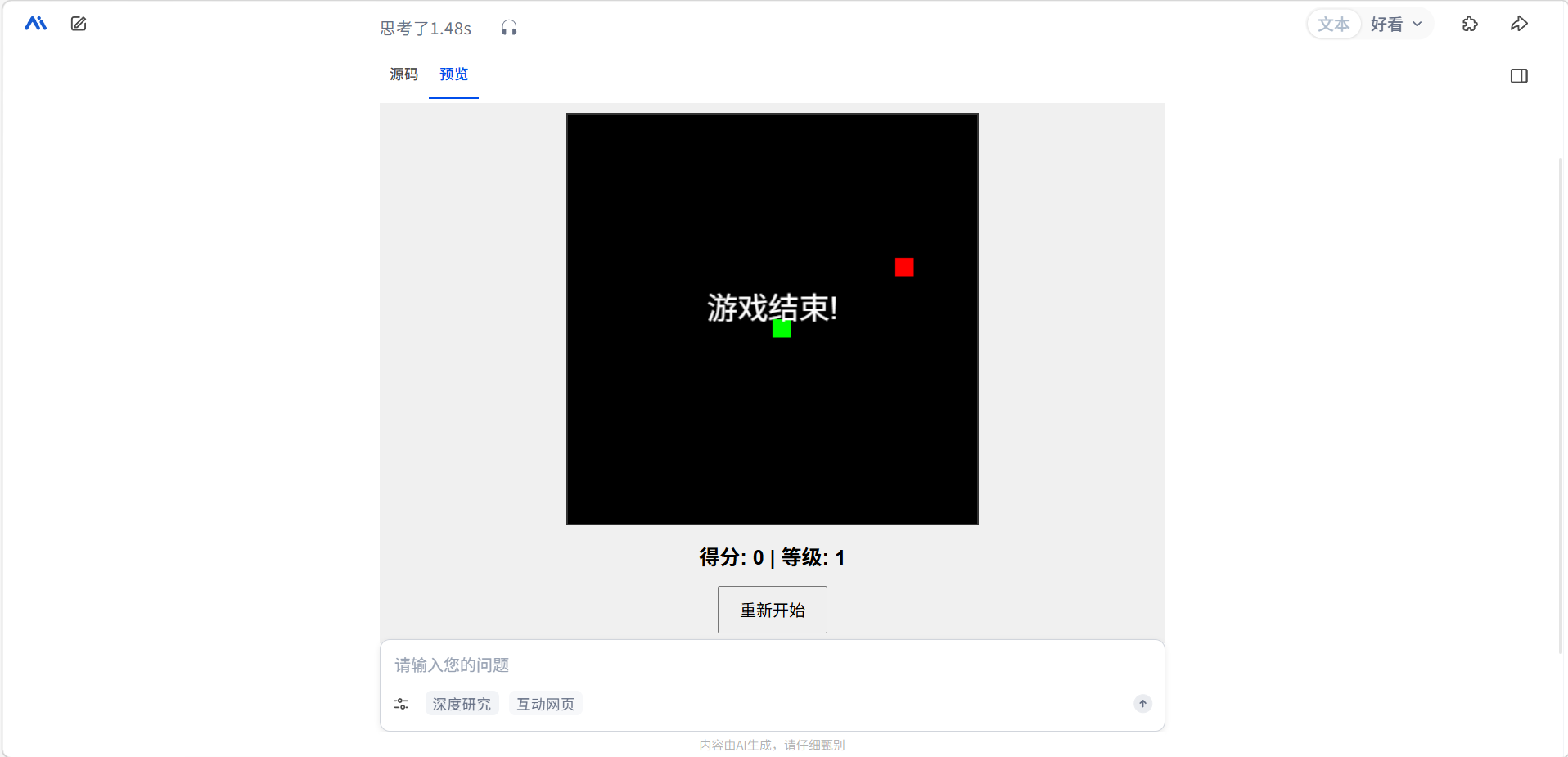 写游戏功能可以帮你快速生成网页小游戏的代码,并直接在浏览器中运行体验。你可以用它来快速做出经典游戏的复刻版,也可以描述一个全新的玩法让AI帮你实现。生成后如果觉得某些地方需要调整(比如难度太高、颜色不好看),可以直接在对话中追加修改需求。在对话框下方选择「设置」>「我能干点啥?」>「写游戏」,输入需求即可使用。