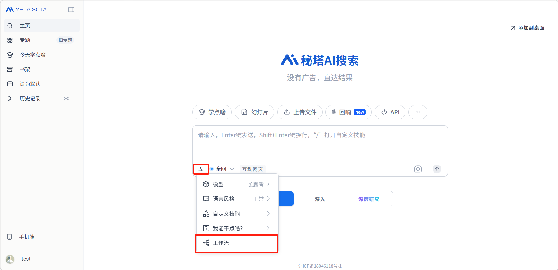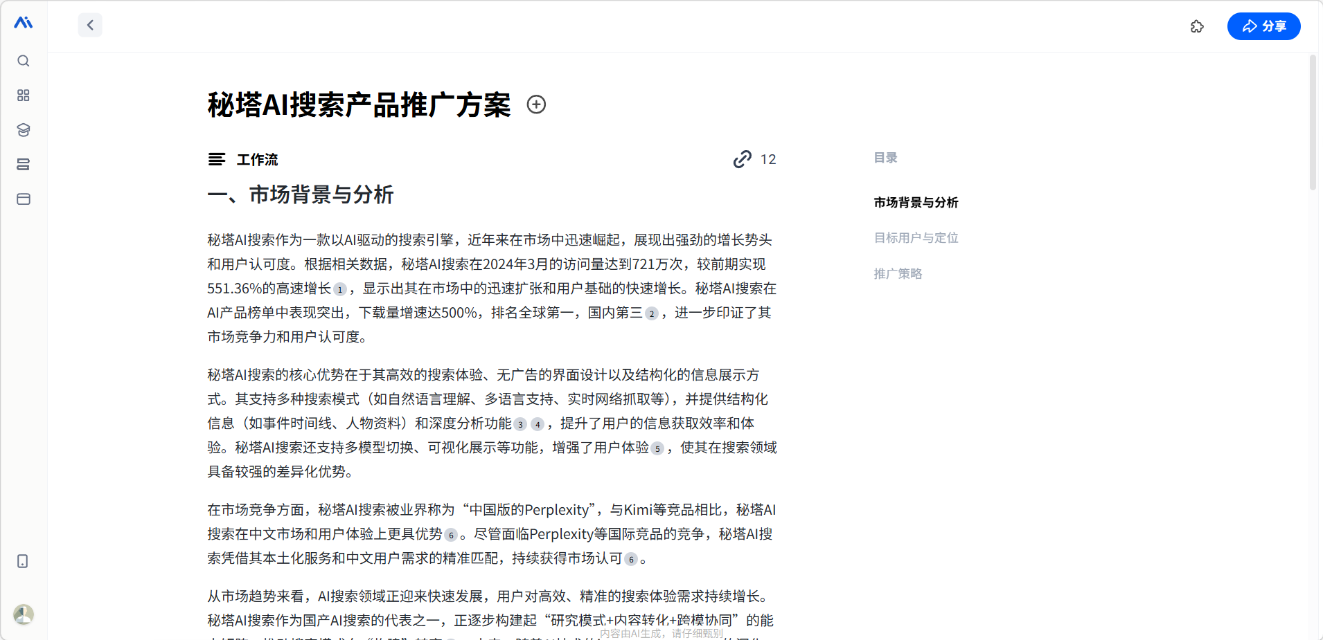 工作流是秘塔AI搜索面向专业用户推出的自动化研究功能。它内置了大量专业模板,覆盖行业研究、市场分析、金融投资、运营策划等多个场景,只需输入关键信息,AI便会自动按照预设框架完成数据收集和报告生成。它预设了专业的研究框架和输出格式,AI会按照这些框架自动完成多轮搜索、数据整理和报告撰写,最终输出一份接近专业咨询公司水平的结构化报告。