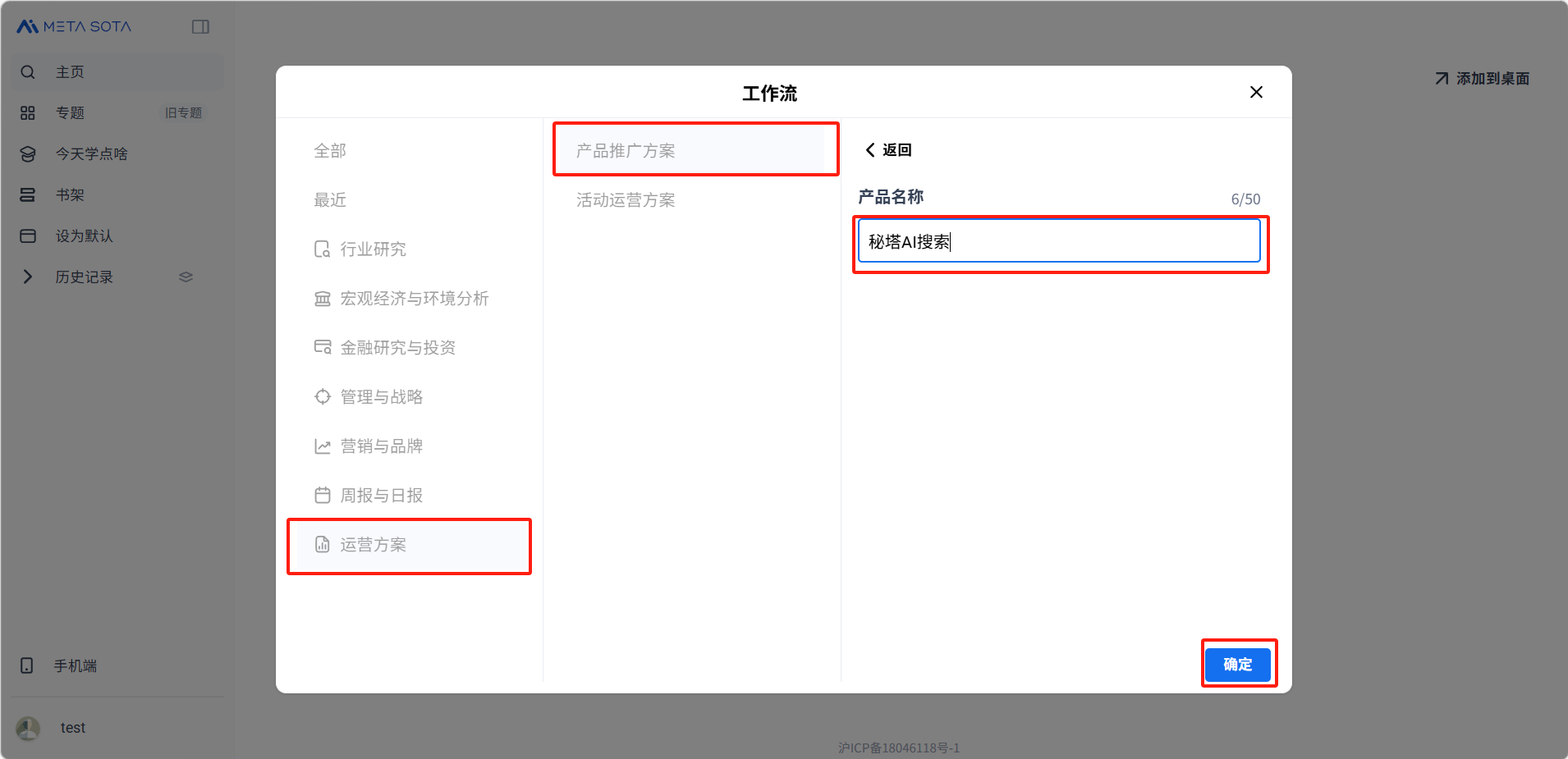 在工作流面板中选择合适的模板,输入所需信息后点击「确认」。