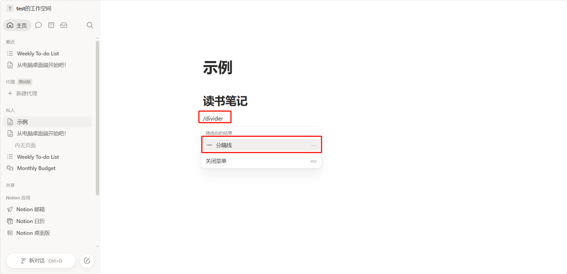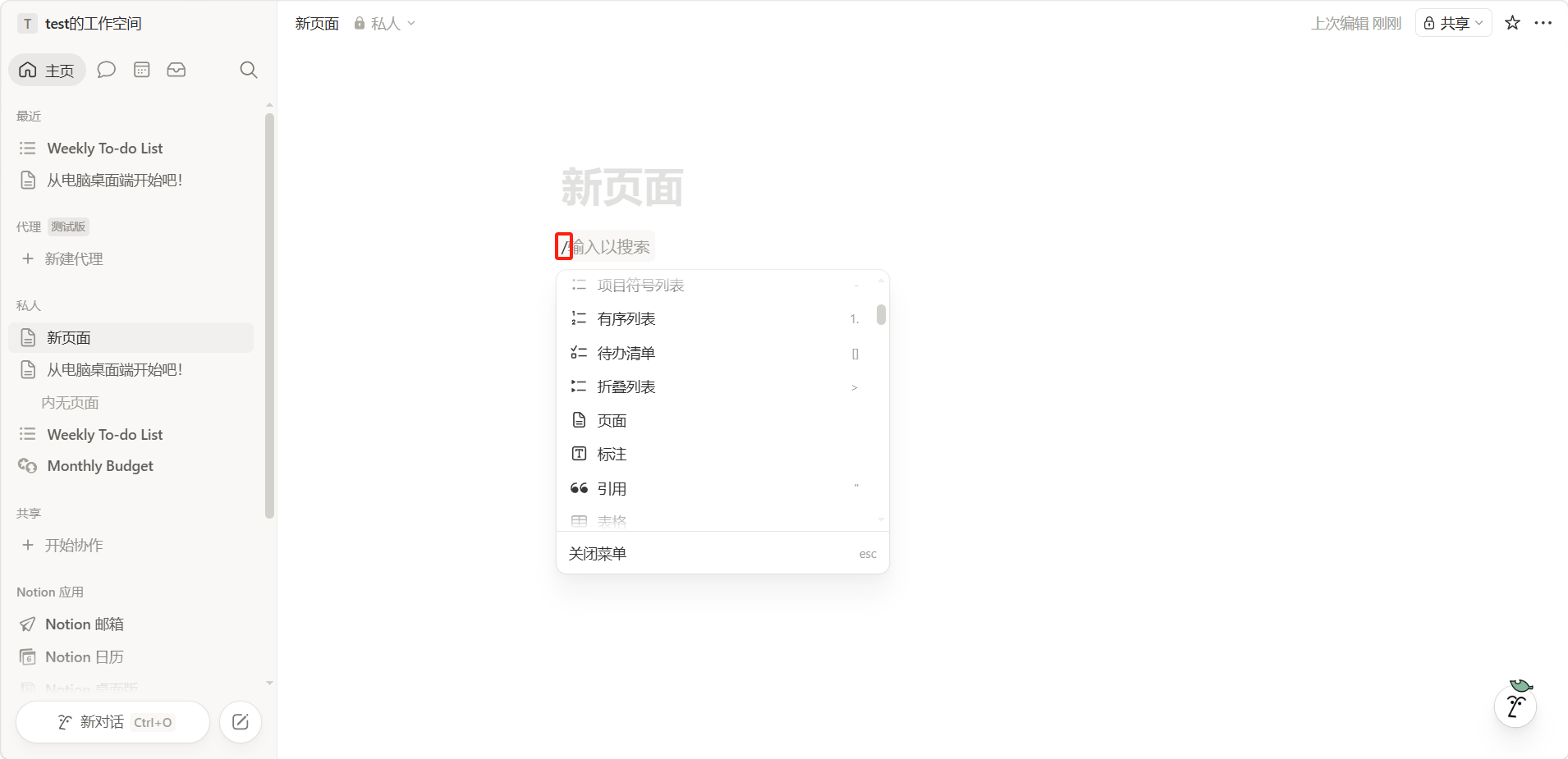 在页面中任何空白行输入「/」,会弹出区块选择菜单,从中选择你需要的区块类型即可插入。