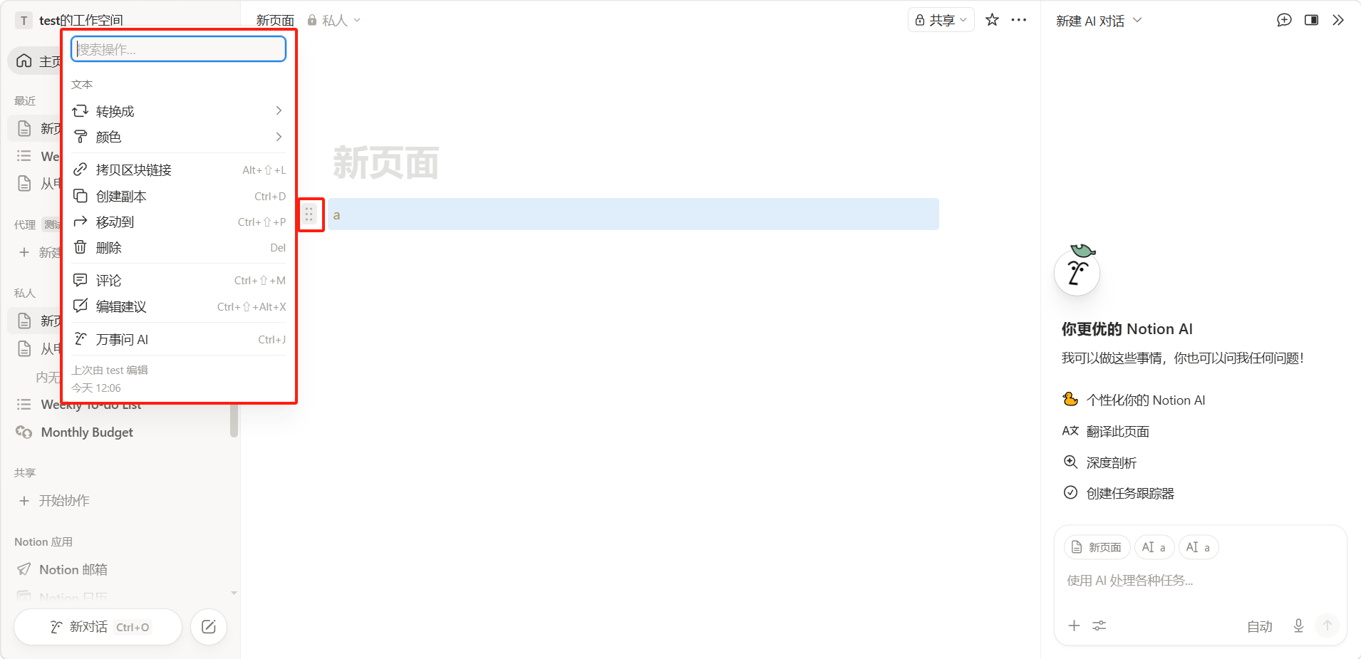移动到其他页面:选择「移动到」,可以将区块转移到工作空间中的其他页面。